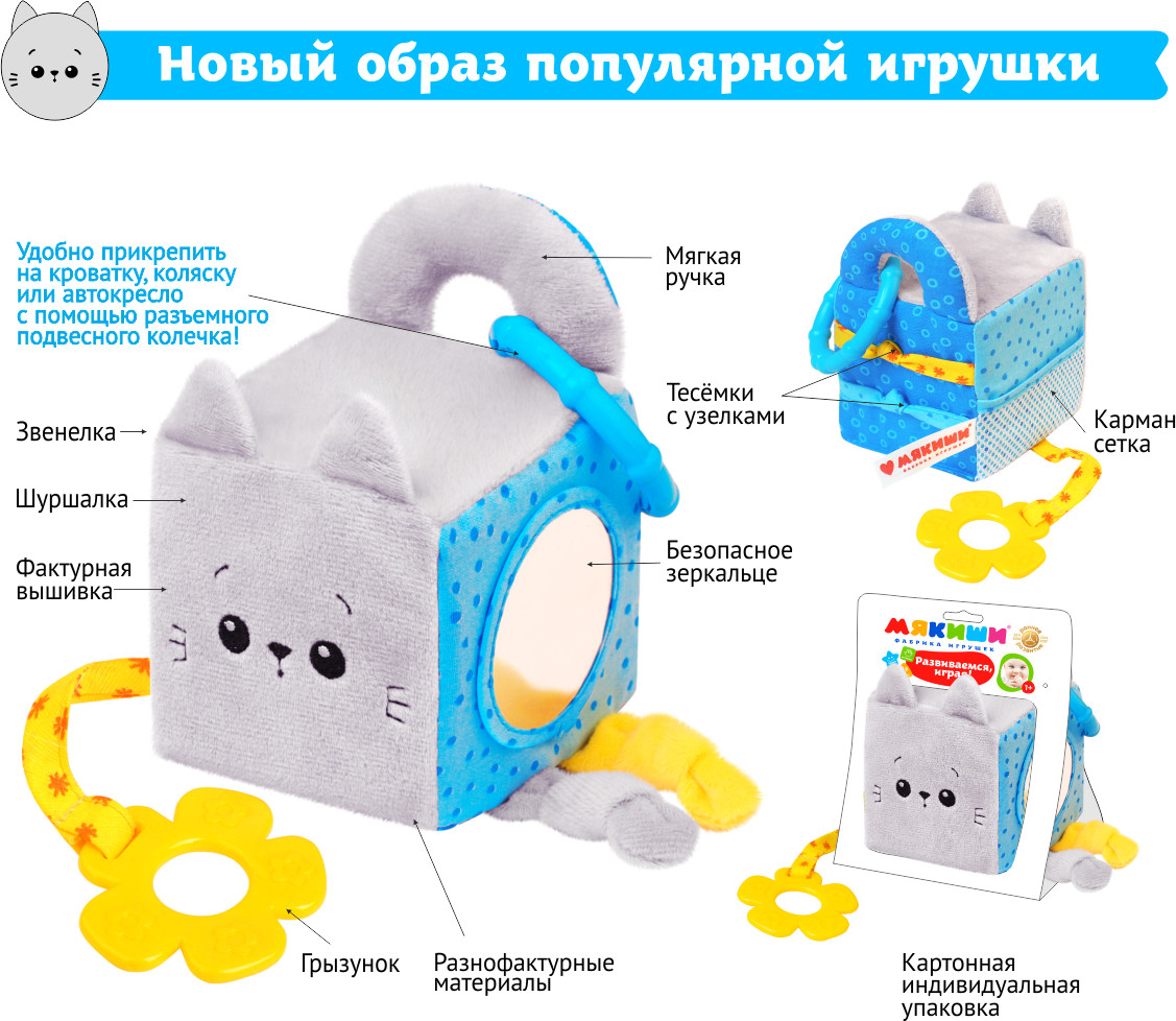 Кубик многофункциональный: он шуршит, звенит, у него есть безопасное зеркальце, грызунки, кармашки и петельки. Игрушку удобно прикрепить на кроватку, коляску или автокресло с помощью разъемного подвесного колечка. Сам кубик сшит из приятных на ощупь материалов.