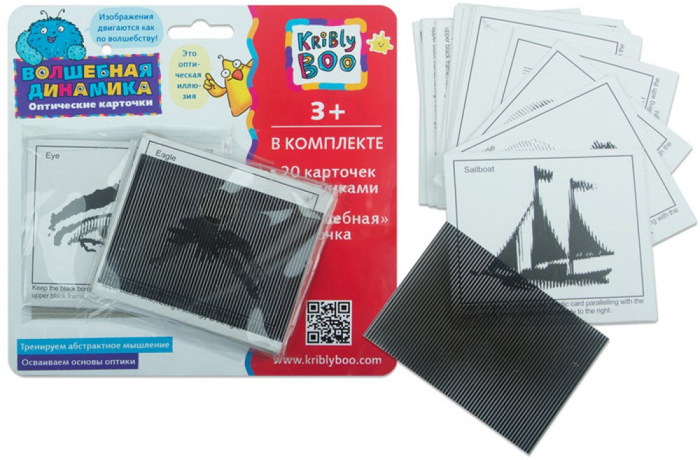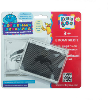 Kribly Boo Карточки оптические «Волшебная динамика»В данный момент этот товар отсутствует в продаже. Возможно, у нас найдется аналогичный или похожий товар здесь. Словно по волшебству, загадочные образы на карточках вдруг оживают, как в черно-белом мультфильме, — балерина танцует, бейсболист замахивается для удара по мячу, велосипедист стремительно мчится вперед. Все это происходит из-за оптического эффекта обмана зрения или иллюзии. Такой фокус легко исполнить с помощью оптических карточек от Крибли Бу: нужно лишь наложить карточку-пленку поверх изображений на картонных карточках и подвигать вперед-назад. Потрясающий фокус поразит не только детей, но и взрослых, ведь принцип этой оптической иллюзии — создание изображений при помощи наложения на лист элементов персонажей — лежал у истоков мультипликации 19 века. |
