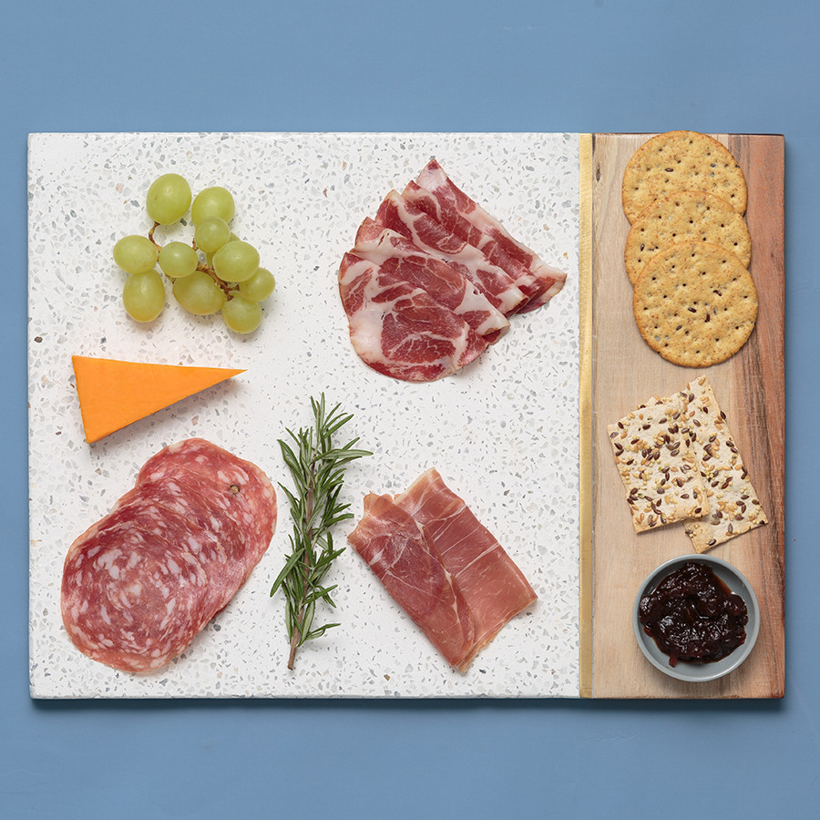 Стильная сервировочная доска из камня и акации разнообразит подачу закусок и украсит пространство. Камень устойчив к сколам и повреждениям. Акация не боится влаги. Такая доска стильно дополнит сервировку стола и станет практичным приобретением для вашей кухни.