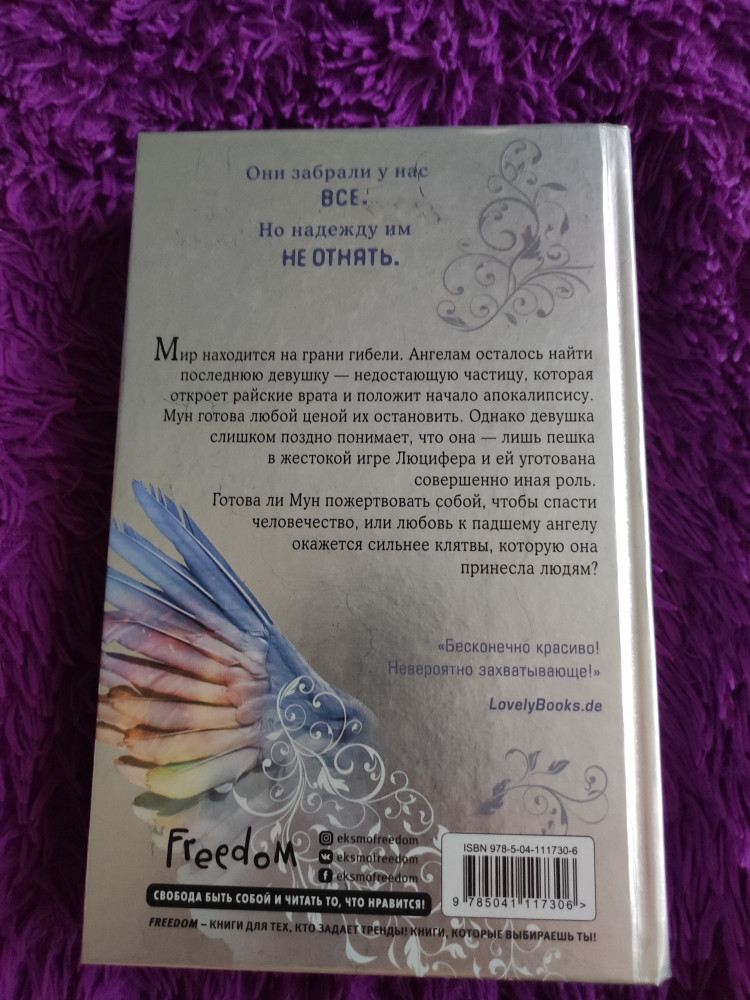 Достаточно тяжёлое фэнтези в моральном плане, но всё же в нём есть что-то волшебное и загадочное. Серия в целом, мне понравилась, Сильная, импульсивная главная героиня, загадочный и харизматичный Люцифер и верные друзья. Я абсолютно уверена, что буду бесконечно скучать по данной трилогии...