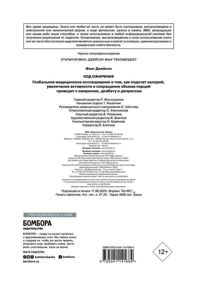 💳 Оплатить за товар можно при получении 🇰🇿 Есть бесплатная доставка по Казахстану от 1 дня 🎁 Копите бонусы с каждой покупки Серия: Открытия века: Джейсон Фанг рекомендует Искусство медицины очень своеобразно. Время от времени возникают методы лечения, которые на самом деле не работают. По инерции эти методы передаются от одного поколения врачей к последующему и сохраняют жизнеспособность удивительно долго, несмотря на отсутствие их эффективности. К сожалению, лечение ожирения стоит в одном ряду с этими примерами. Уже более тридцати лет врачи рекомендуют пациентам с ожирением переходит на обезжиренную, низкоуглеводную диету. Несмотря на это, эпидемия ожирения продолжает набирать обороты. Перед вами революционная книга, которая переворачивает наше представление о причинах набора веса и предлагает простую и эффективную программу по изменению себя. |