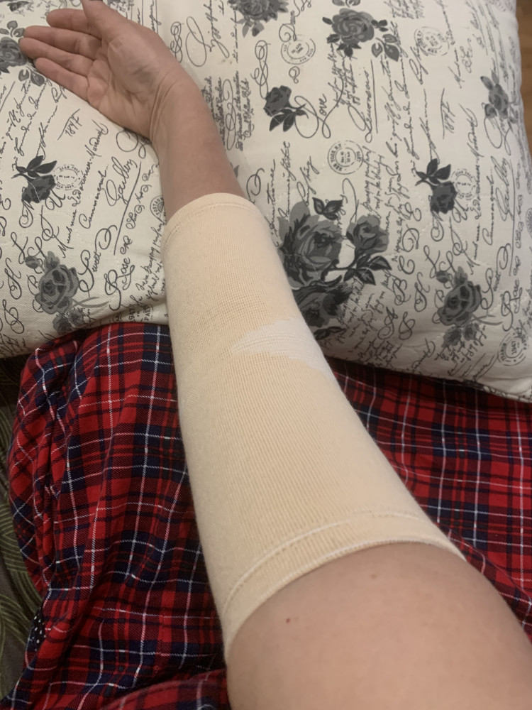 Материал плотный, изготовлен очень аккуратно. Размер S оказался большеват на обхват предплечья 26 см, хотя указано 23-26. Из-за этого не было нужной поддержки больного места. Пришлось постирать в горячей воде, ткань немного подсела и создалась нужная компрессия.