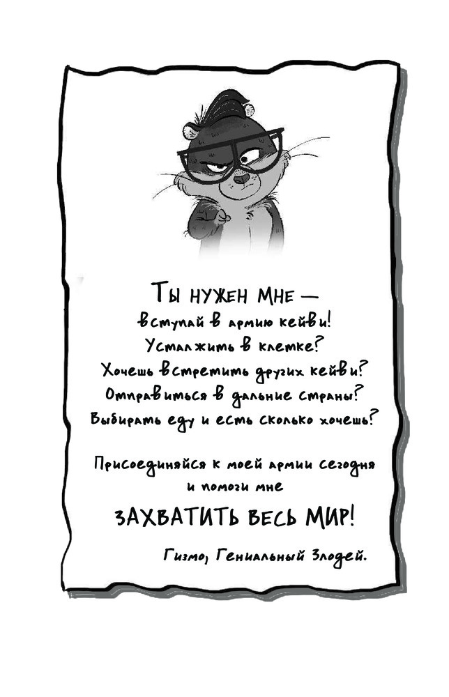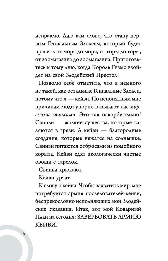 Серия: Приключения Коржика Коржик обожает новую соседку — карликовую свинку Пинки. И она отвечает ему полной взаимностью. Они даже собираются отправиться вместе на парад выпускников школы домашних питомцев. Ведь они лучшие друзья. Но Гизмо знает правду. Пинки — новая сообщница Коржика. И они вместе хотят помешать Гизмо захватить этот мир. Но у них ничего не выйдет! Уж Гизмо для этого постарается! Ведь он умнее всех этих злодеев из комиксов и гораздо более могущественный, чем Дарт Вейдер! Гизмо уже заказал он-лайн летающую машину, и это только начало! Автор Сьюзен Селфорс придумывает самые разные истории всё время. А вдохновение она черпает благодаря любимым писателям Чарльзу Диккенсу и Роальлу Далю. «Коварный план Гизмо» — вторая книга серии о самой дружелюбной на свете собаке и мрачном гении-морской свинке. |