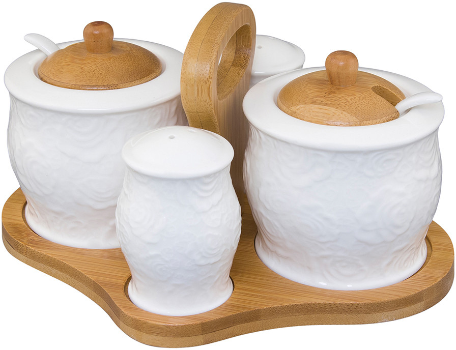 Elan Gallery Набор для специй и хранения продуктов «Белые розы»В данный момент этот товар отсутствует в продаже. Возможно, у нас найдется аналогичный или похожий товар здесь. Серия: Белые розы Набор из серии «Белые розы» состоит из набора для специй и двух банок для хранения объемом 300 мл каждая с деревянной крышкой, фарфоровой ложкой и деревянной подставкой с ручкой выполнен из высококачественного фарфора и натурального бамбука. Теплое цветовое решение, изящный рельефный рисунок на фарфоре и удобство использования делают этот набор желанным подарком любой хозяйке. У банок для хранения широкое горло, которое удобно мыть, а бамбуковая крышка не позволит продуктам намокнуть. В серии фарфоровой посуды с использованием бамбука представлен широкий ассортимент товаров для сервировки стола, которые несомненно впишутся в любой интерьер благодаря лаконичному дизайну, натуральным материалам и высокой функциональности. Такому подарку будет рада любая хозяйка! |