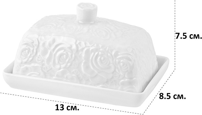 Хорошая маслёнка из серии посуды "Белые розы"! До этого брала чайник, сахарницу из этой серии. Спасибо Flip за прекрасные товары!