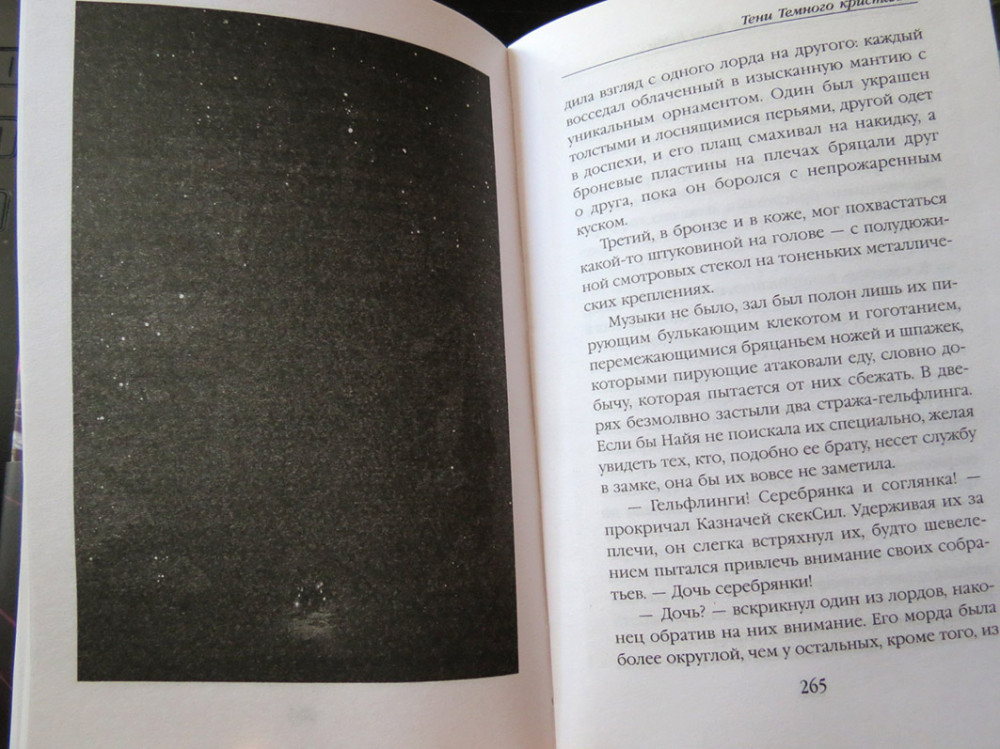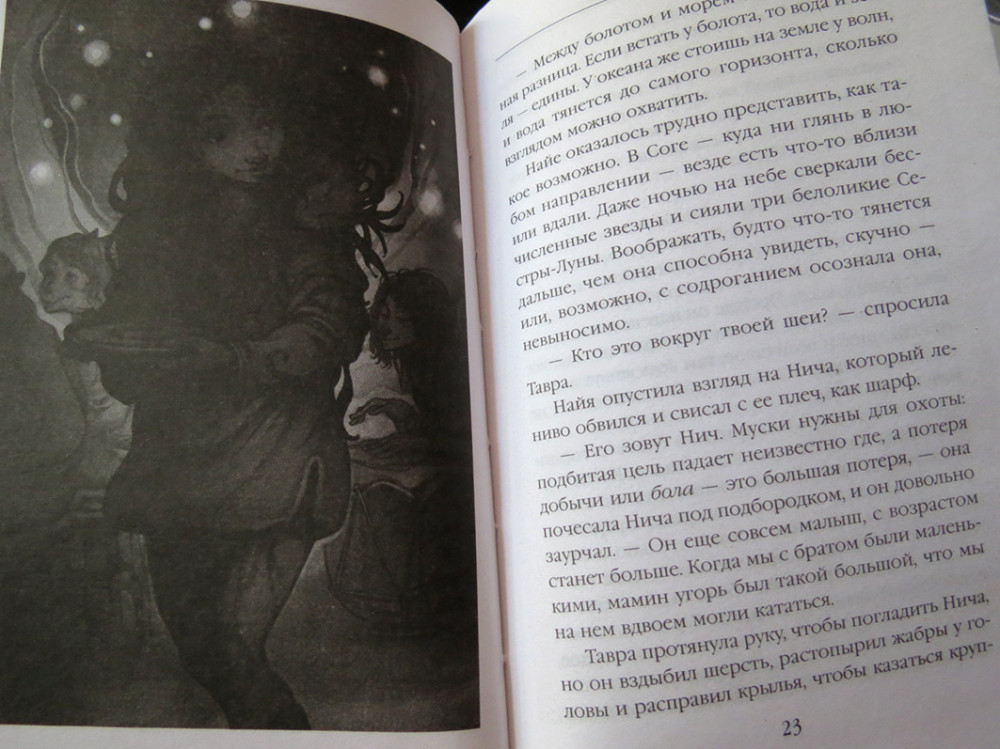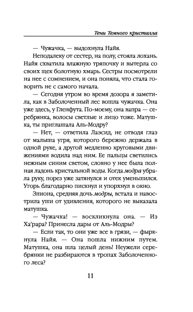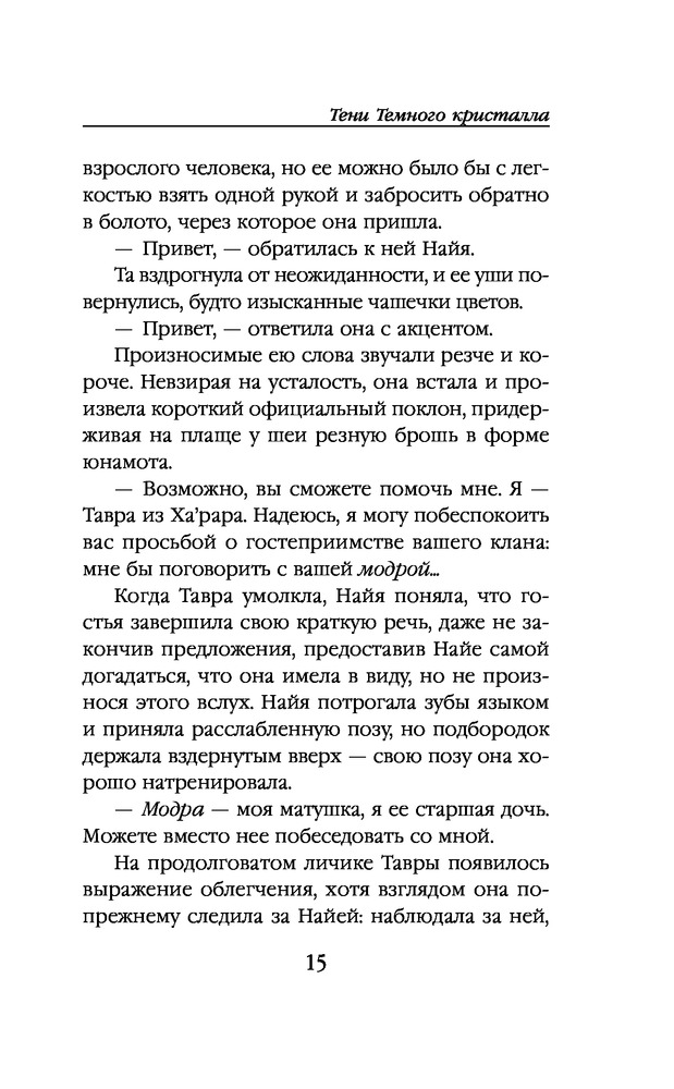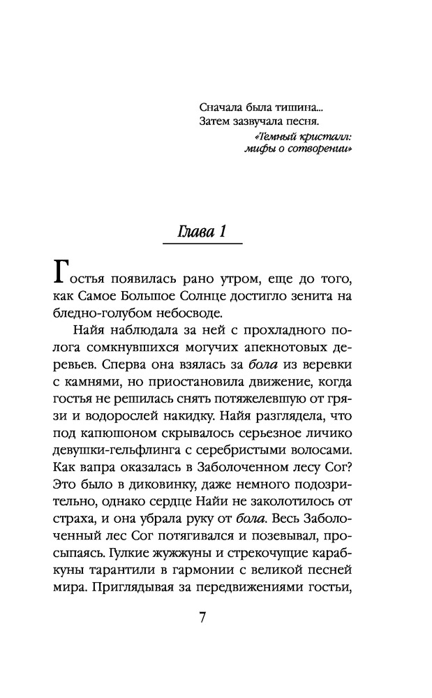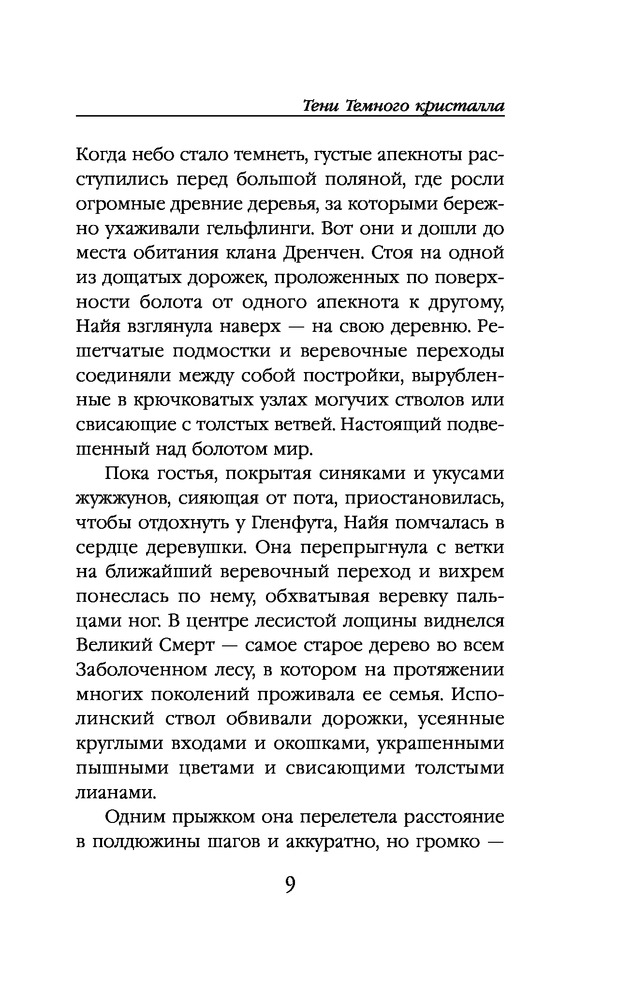 Книга написана по миру кукольного фильма "Тёмный кристалл" 1982 года, недавно еще сняли телесериал. Благодаря художнику Брайану Фрауду, известному иллюстратору фейри, мир получился красивым и проработанным. В этой книге рассказывается другая история, не та, что в фильмах. Книга маленькая, с манжеткой, которую удобно использовать как закладку - один клапан для текущей страницы, другой держу на глоссарии. На обложке пометка, что это только первая часть. С первых страниц много необычных терминов, в конце книги есть глоссарий с пояснениями. Читать интересно, есть иллюстрации, но их мало и трудно что-либо разглядеть, местами просто черный квадрат. Бумага шершавая, низкого качества, конечно, на такой бумаге иллюстрации смотрятся ужасно.