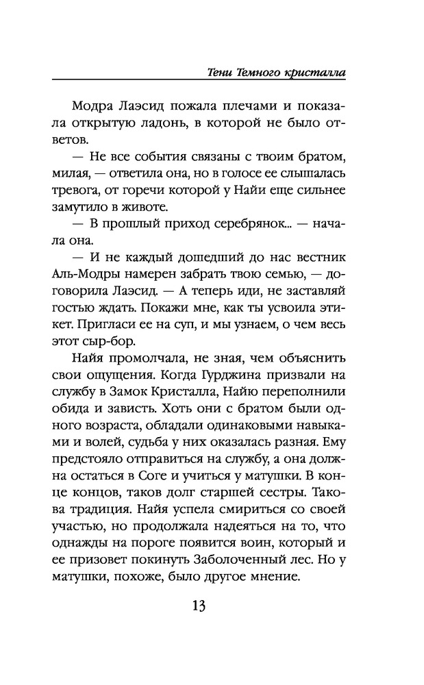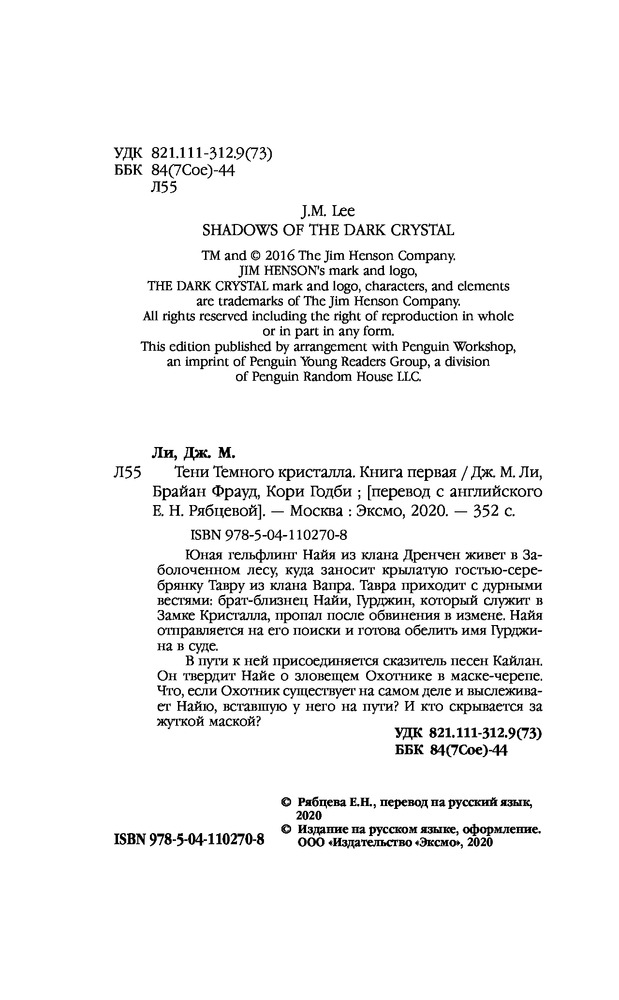 Тени Темного кристалла. Книга перваяВ данный момент этот товар отсутствует в продаже. Возможно, у нас найдется аналогичный или похожий товар здесь. Серия: Netflix. Темный кристалл Юная гельфлинг Найя из клана Дренчен живет в Заболоченном лесу, куда заносит крылатую гостью-серебрянку Тавру из клана Вапра. Тавра приходит с дурными вестями: брат-близнец Найи, Гурджин, который служит в Замке Кристалла, пропал после обвинения в измене. Найя отправляется на его поиски и готова обелить имя Гурджина в суде. В пути к ней присоединяется сказитель песен Кайлан. Он твердит Найе о зловещем Охотнике в маске-черепе. Что, если Охотник существует на самом деле и выслеживает Найю, вставшую у него на пути? И кто скрывается за жуткой маской? |