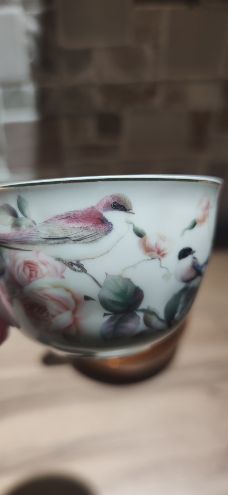 это уже второй комплект первый брала в подарок чашечка из тонкого фарфора, блюдце из более плотного фарфора рисунок милый