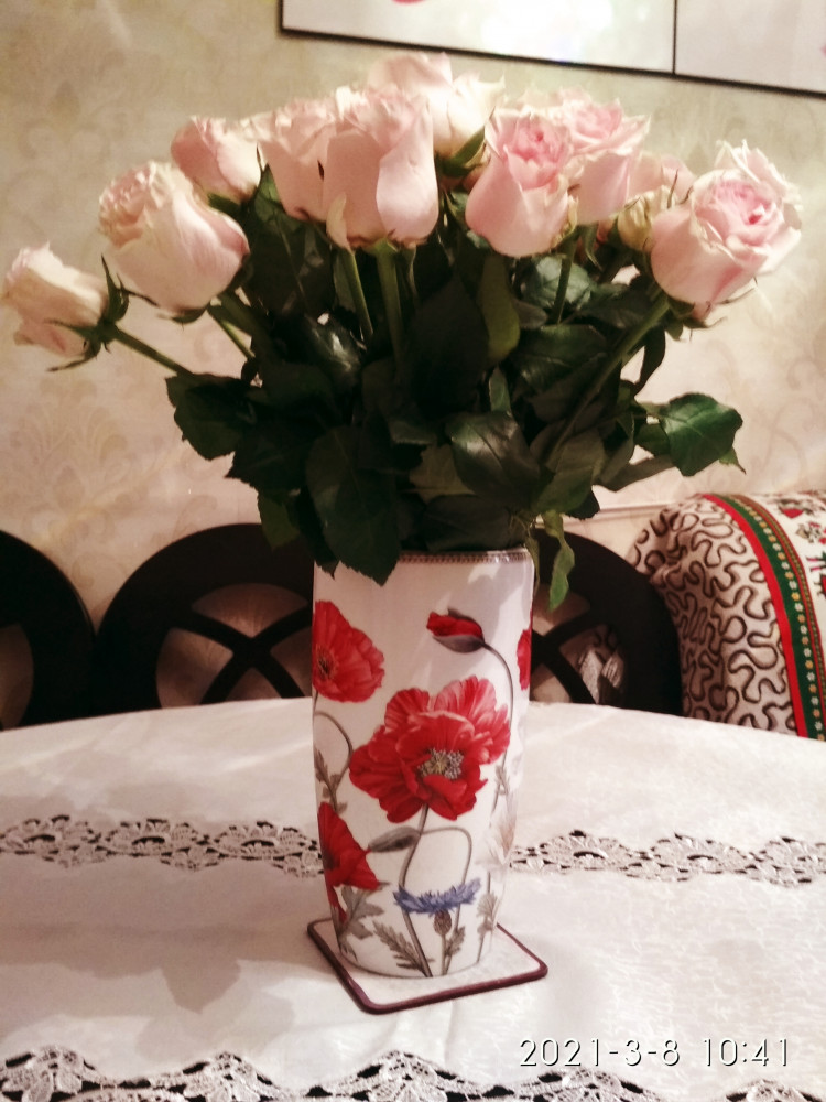 Ну, как видите, в жизни она даже ярче и красивее, чем в рекламе, очень емкая, поместился даже такой болшой букет от зятя на 8-е Марта. Ну очень рекомендую, кому нужна подобная ваза