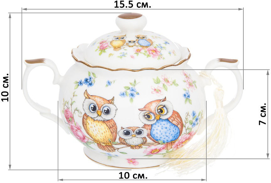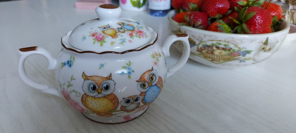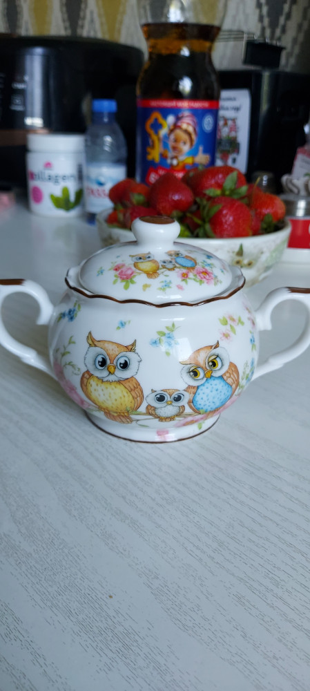 Решила собрать коллекцию, это мой второй заказ из серии «Совушки». Первый был бокал для чая на 350 мл. Оказался удобным, устойчивым и не блеклая расцветка красок, не изменилась даже после нескольких раз мытья в посудомойке. После этого и заказала сахарницу. Не громоздкая, хорошо вписалась в интерьер вещей на столе. Не хватает пары, поэтому в следующем заказе возьму салфетницу.