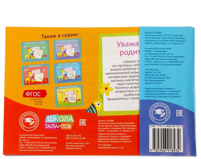 💳 Оплатить за товар можно при получении 🇰🇿 Есть бесплатная доставка по Казахстану от 1 дня 🎁 Копите бонусы с каждой покупки Серия: Мои первые прописи Буква-Ленд Серия «Мои первые прописи» познакомит ребёнка с письмом в форме увлекательной игры. Все элементы и картинки прорисованы толстым контуром, их удобно обводить и раскрашивать. |