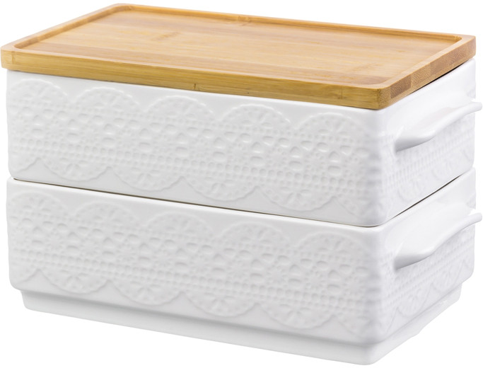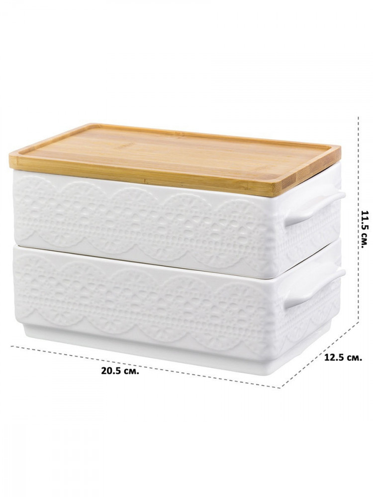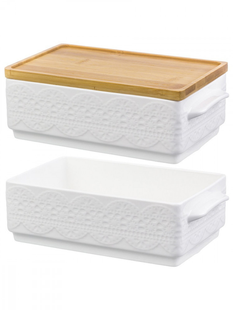 Elan Gallery Набор блюд для холодца «Кружево»В данный момент этот товар отсутствует в продаже. Возможно, у нас найдется аналогичный или похожий товар здесь. Серия: Белое кружево Набор из 2 блюд для холодца «Кружево» украсит стол и позволит сохранить еду свежей благодаря крышке. Красиво смотрится на столе и удобно размещается в холодильнике. Изготовлены из белоснежного фарфора, имеют ручки и украшены кружевными узорами. Бамбуковая крышка идеально дополняет образ. |