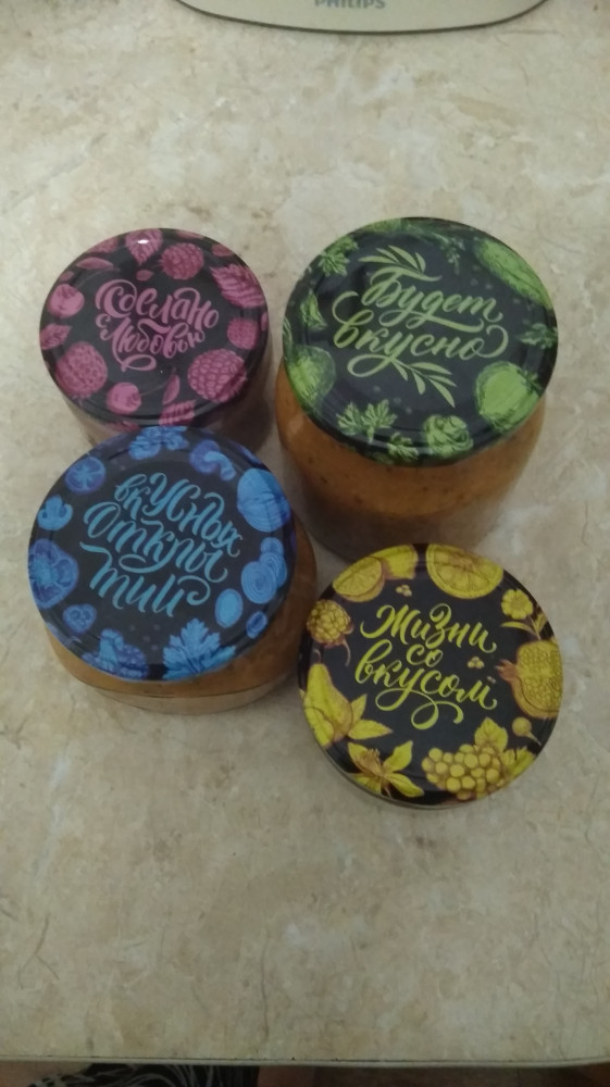 По сути самые обычные крышки. Просто для души. Приятно открыть баночку. Спасибо сотрудникам, все 4 крышки положили разные, как просила