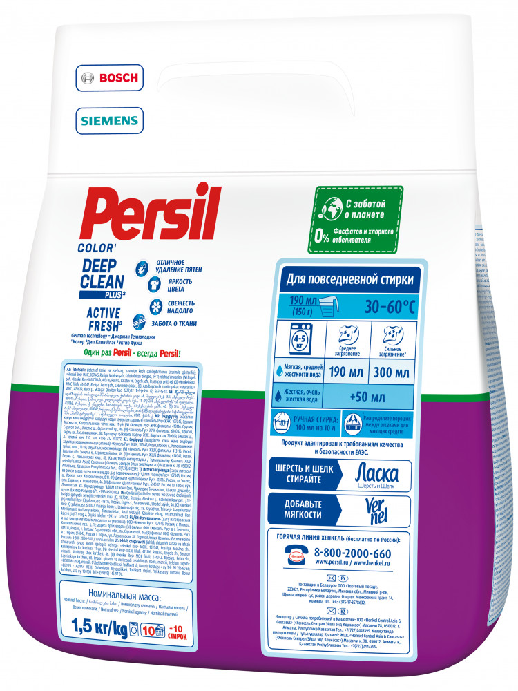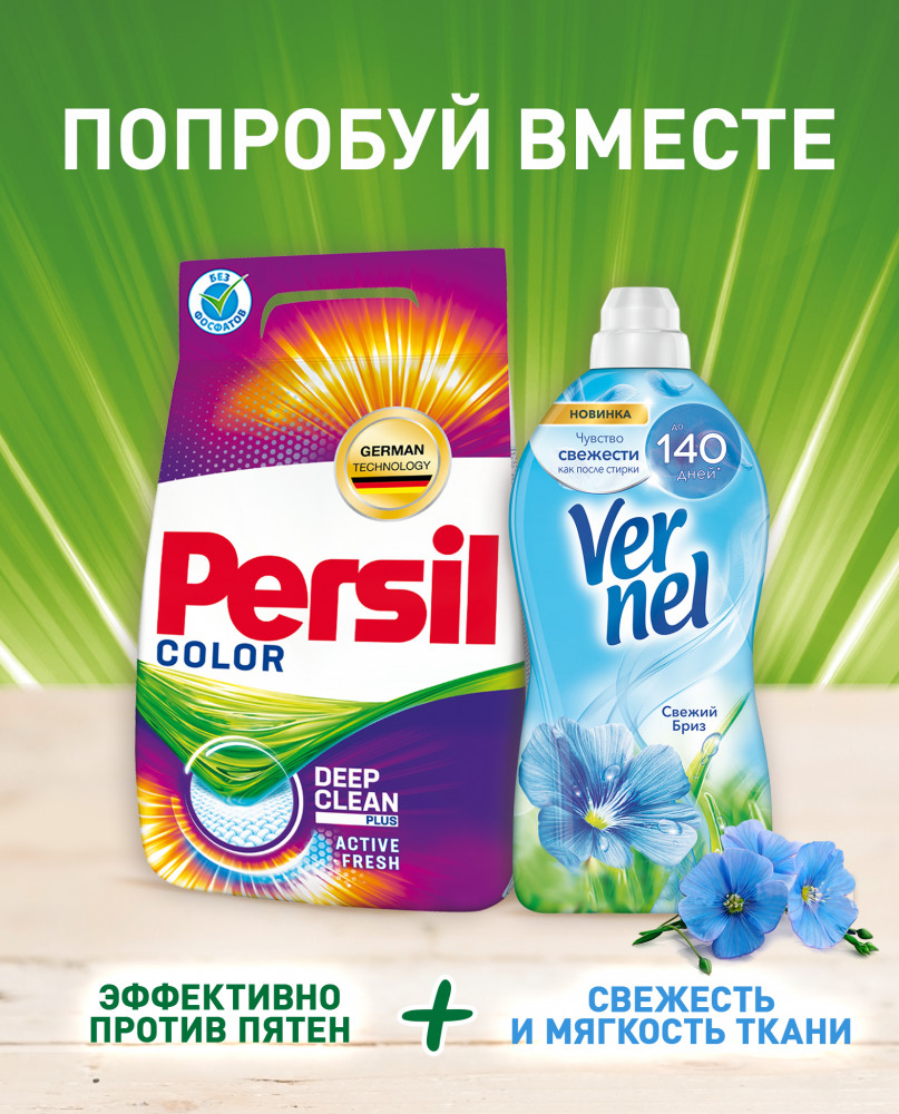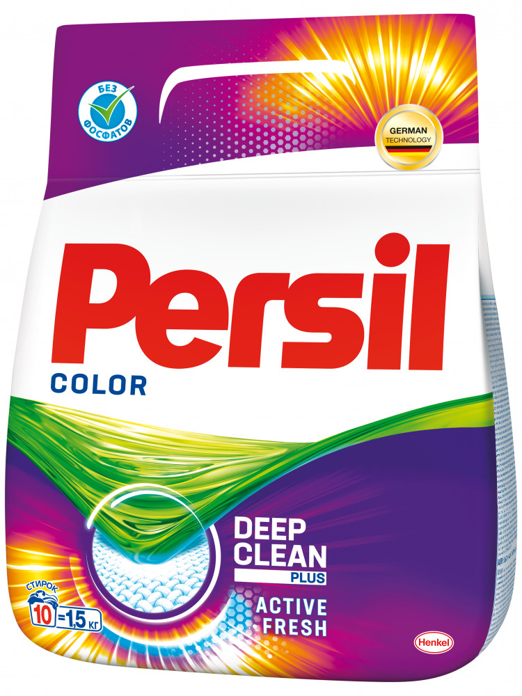Persil Color — стиральный порошок с сильной формулой, которая содержит активные капсулы пятновыводителя. Капсулы пятновыводителя быстро растворяются в воде и начинают действовать на пятно уже в самом начале стирки. Благодаря специальной формуле Persil Color отлично удаляет даже сложные пятна, а специальные цветозащитные компоненты сохраняют яркие цвета ткани.
