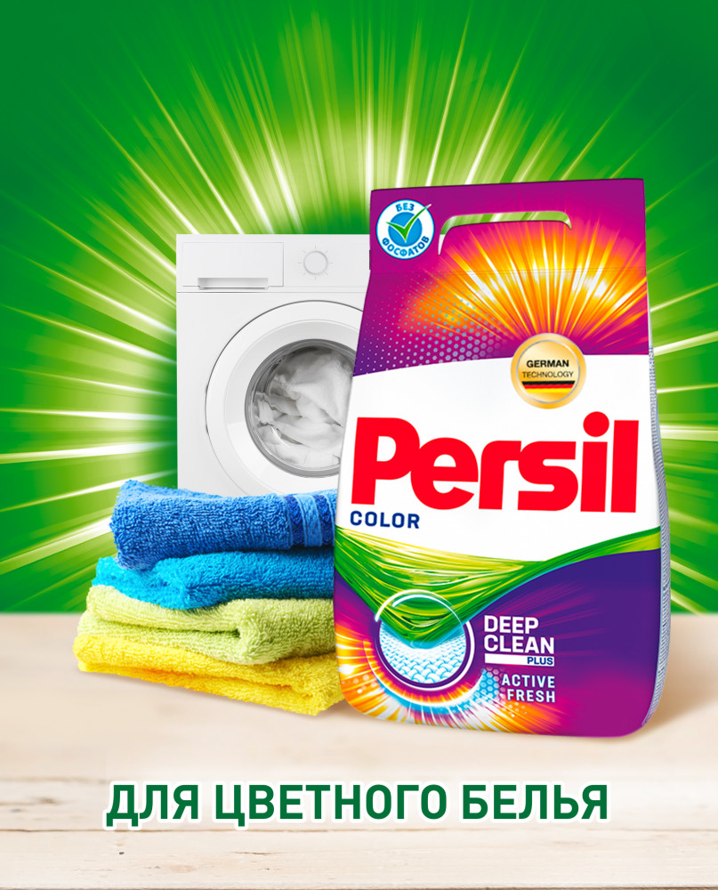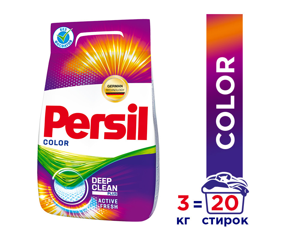 Persil Color — стиральный порошок с сильной формулой, которая содержит активные капсулы пятновыводителя. Капсулы пятновыводителя быстро растворяются в воде и начинают действовать на пятно уже в самом начале стирки. Благодаря специальной формуле Persil Color отлично удаляет даже сложные пятна, а специальные цветозащитные компоненты сохраняют яркие цвета ткани.