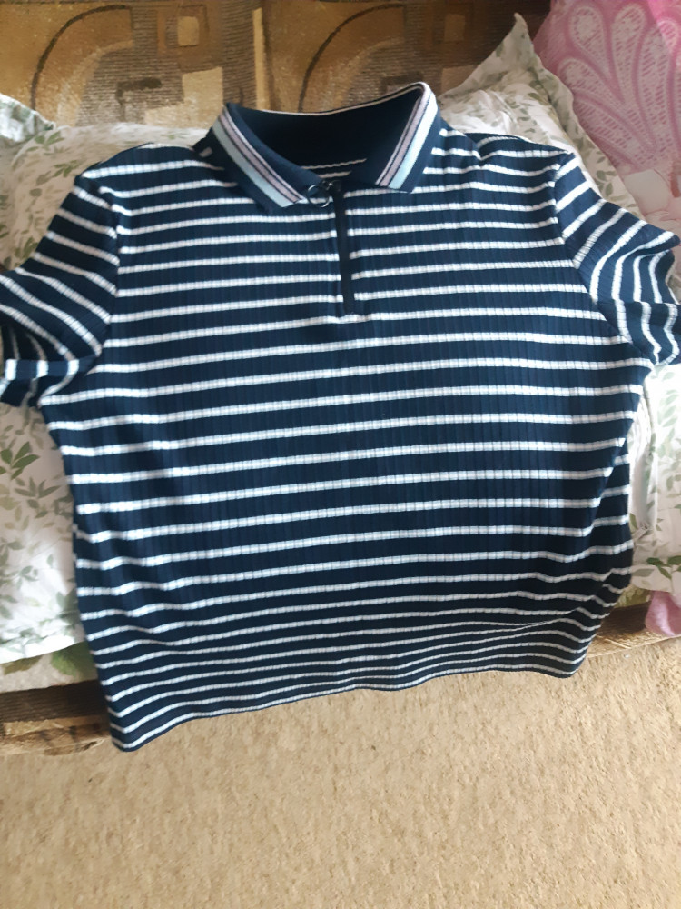 Футболка класс! Очень люблю такой фасон, с воротничком. Немного коротковата правда. Но всё равно классная. Ткань очень приятная к телу.