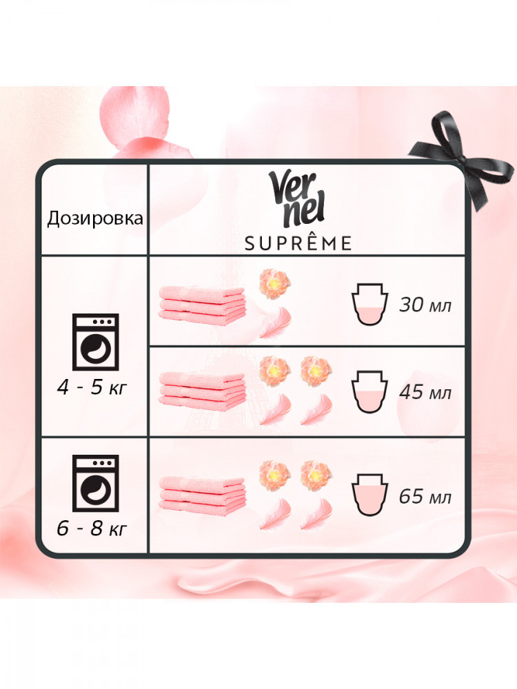 Кондиционер для белья Supreme Romance создан совместно с французскими парфюмерами и обладает элегантным сочетанием аромата роз, белых цветов и цитрусовых нот, которые придадут изысканный аромат Вашему белью. Кондиционер для стирки содержит миллионы разглаживающих частиц для роскошной мягкости и заботе о ткани. Вместе с кондиционером для белья Романс окутайте себя изысканным французским ароматом и перенеситесь в атмосферу Парижа. Облегчает глажку и обладает антистатическим эффектом. Кондиционер дарит элегантное сочетание аромата роз, белых цветов и цитрусовых нот. На одну стирку достаточно меньше половины колпачка. Подходит для всех видов тканей. Избегайте непосредственного контакта средства для стирки с тканью. Концентрированный ополаскиватель для белья Vernel просто использовать.