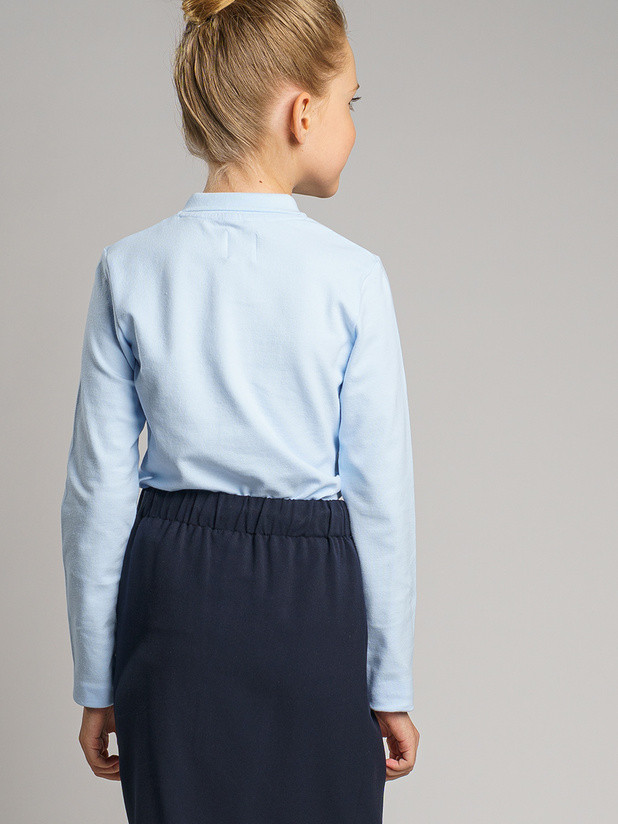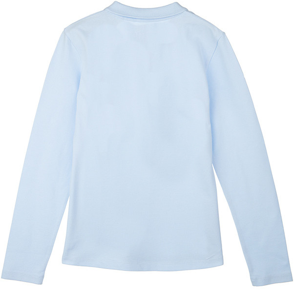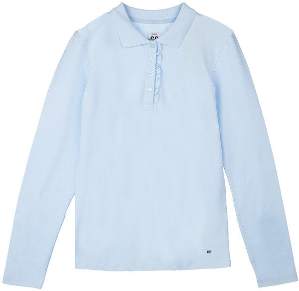 Футболка-поло с длинным рукавом из плотного трикотажного полотна с добавлением эластана для комфорта в носке. Шов горловины декорирован изящной тесьмой с люрексом. Планка с застежкой на пуговицы, декорирована рюшей.