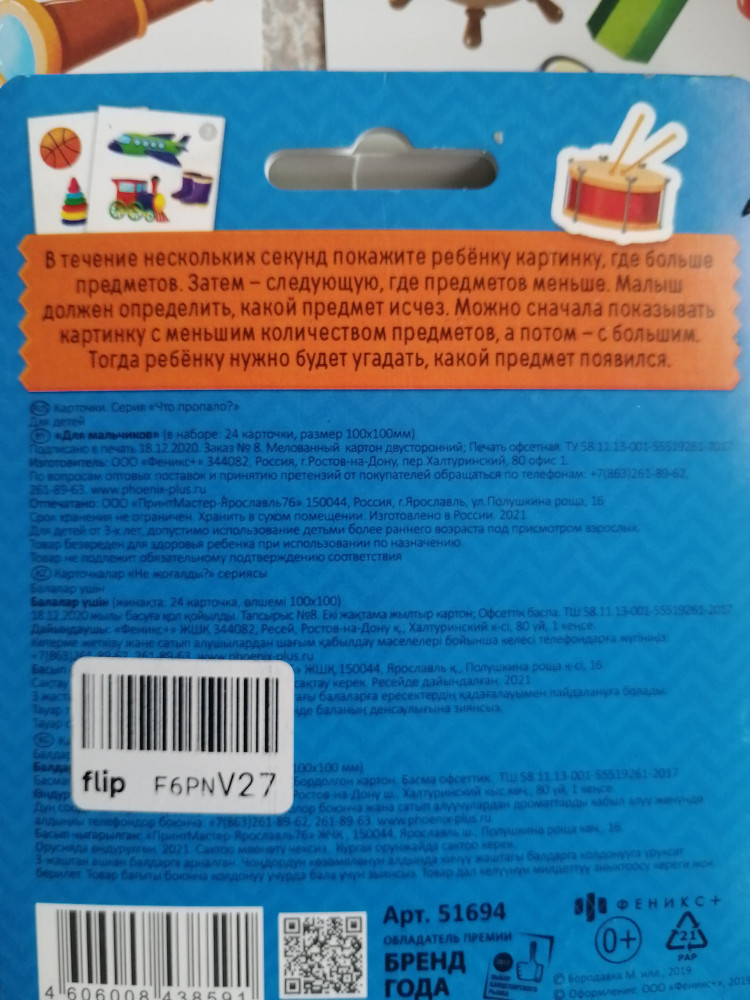 Феникс + Карточки развивающие «Для мальчиков»В данный момент этот товар отсутствует в продаже. Возможно, у нас найдется аналогичный или похожий товар здесь. Серия: Что пропало? Ребенку будет интереснее обучаться, если в качестве пособий вы будете использовать понятные для него и простые в тоже время карточки с крупными картинками, каждая из которых несет определенную развивающую функцию. Такой набор карточек вы найдете в этом комплекте, который станет отличным подспорьем для родителей. |
