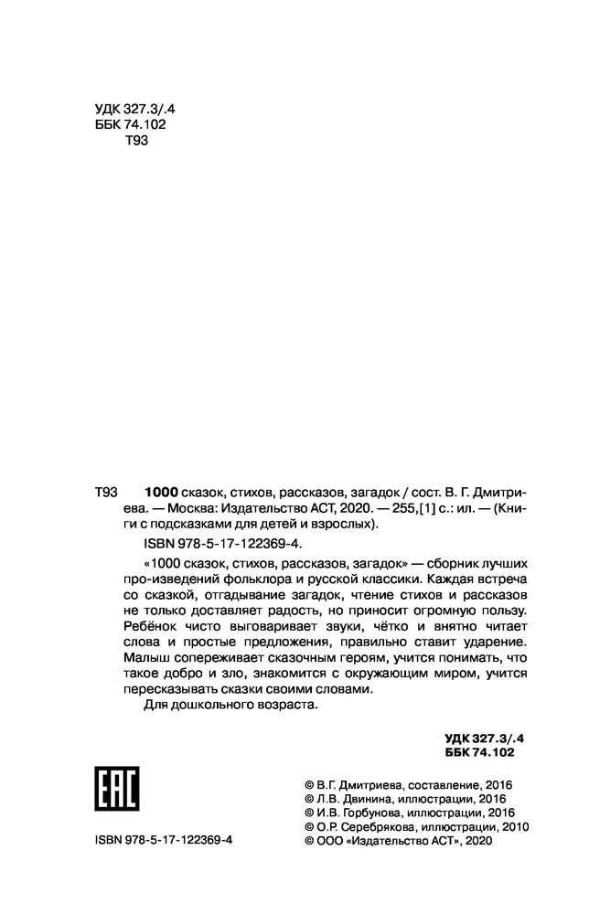 1000 сказок, рассказов, стихов, загадокВ данный момент этот товар отсутствует в продаже. Возможно, у нас найдется аналогичный или похожий товар здесь. Серия: Книги с подсказками для детей и взрослых «1000 сказок, рассказов, стихов, загадок» — сборник лучших произведений фольклора и русской классики. Каждая встреча со сказкой, отгадывание загадок, чтение стихов и рассказов не только доставляет радость, но приносит огромную пользу. Ребёнок чисто выговаривает звуки, четко и внятно читает слова и простые предложения, правильно ставит ударение. Малыш сопереживает сказочным героям, учится понимать, что такое добро и зло, знакомится с окружающим миром, учится пересказывать сказки своими словами. Для дошкольного возраста. |