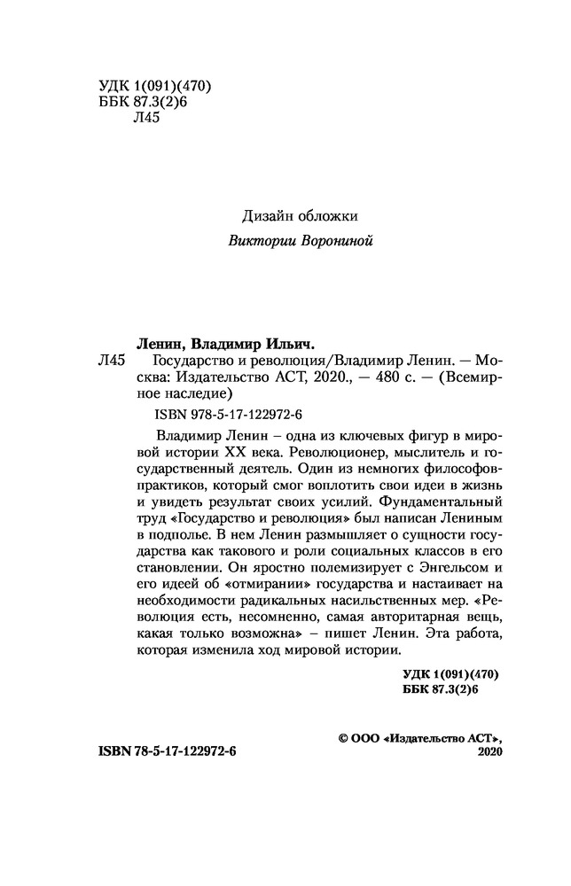 💳 Оплатить за товар можно при получении 🇰🇿 Есть бесплатная доставка по Казахстану 🎁 Копите бонусы с каждой покупки Серия: Всемирное наследие Владимир Ленин — одна их ключевых фигур в мировой истории XX века. Революционер, мыслитель и государственный деятель. Один из немногих философов-практиков, который смог воплотить свои идеи в жизнь и увидеть результат своих усилий. Фундаментальный труд «Государство и революция» был написан Лениным в подполье. В нем Ленин размышляет о сущности государства как такового и роли социальных классов в его становлении. Он яростно полемизирует с Энгельсом и его идеей об «отмирании» государства и настаивает на необходимости радикальных насильственных мер. «Революция есть, несомненно, самая авторитарная вещь, какая только возможна» — пишет Ленин. Эта работа, которая изменила ход мировой истории. |