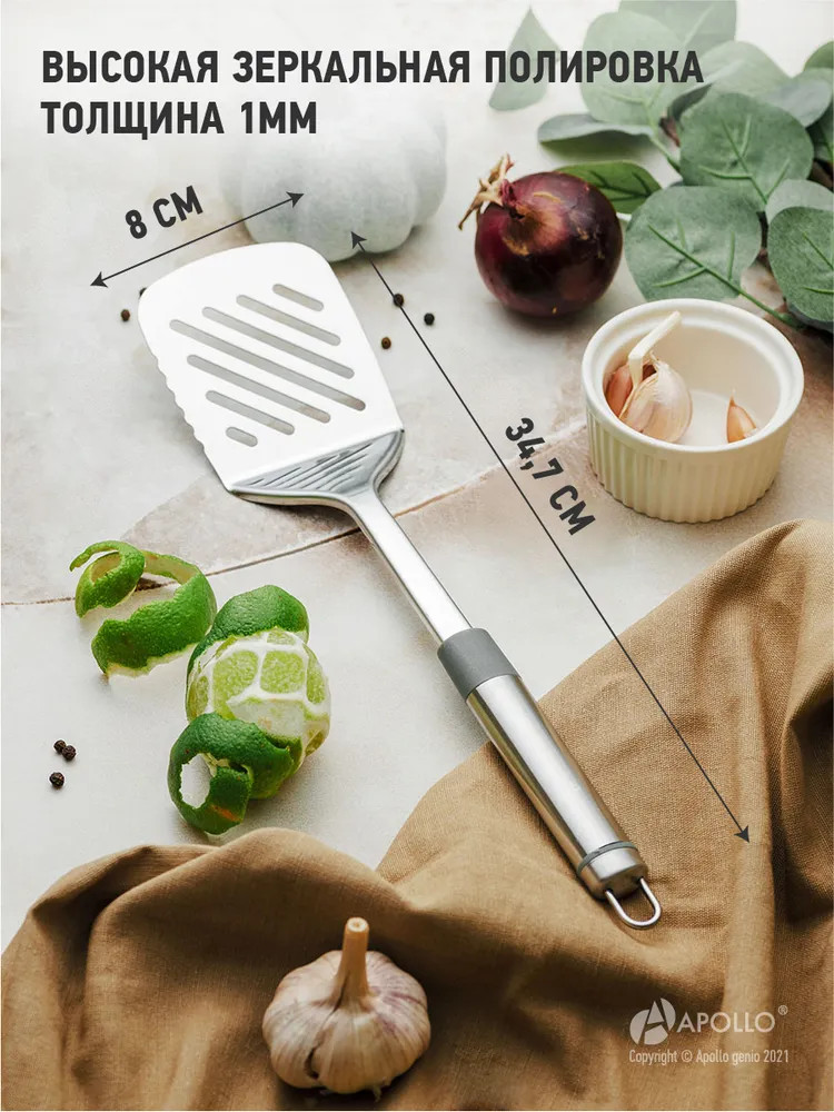 Apollo Лопатка перфорированная «Tesoro»качество стали удобная ручка качество товара В данный момент этот товар отсутствует в продаже. Возможно, у нас найдется аналогичный или похожий товар здесь. Серия: Tesoro Лопатка предназначена для перемешивания и переворачивания продуктов в процессе жарки или тушения, а также подачи готовых блюд. Прорези на лопатке позволяют стекать излишкам масла, соуса или жидкостей. Изделие имеет петлю для подвешивания в любое место на кухне. |