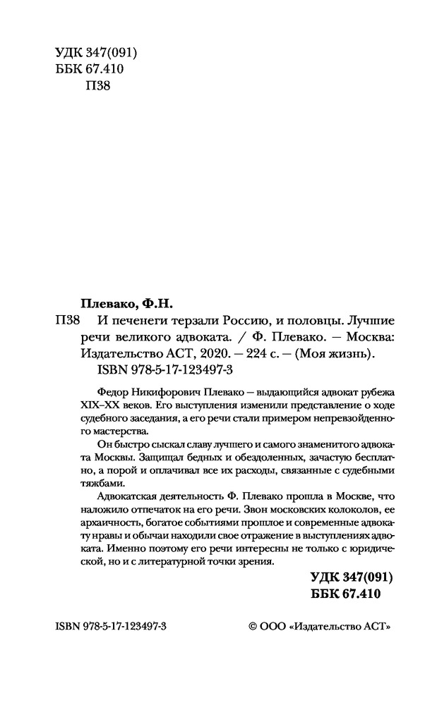 💳 Оплатить за товар можно при получении 🇰🇿 Есть бесплатная доставка по Казахстану 🎁 Копите бонусы с каждой покупки Серия: Моя жизнь Федор Никифорович Плевако — выдающийся адвокат рубежа XIX — XX веков. Его выступления изменили представление о ходе судебного заседания, а его речи стали примером непревзойденного мастерства. Он быстро сыскал славу лучшего и самого знаменитого адвоката Москвы. Защищал бедных и обездоленных, зачастую бесплатно, а порой и оплачивал все их расходы, связанные с судебными тяжбами. Адвокатская деятельность Ф. Плевако прошла в Москве и наложила свой отпечаток на его речи. Звон московских колоколов, ее архаичность, богатое событиями прошлое и современные адвокату нравы и обычаи находили свое отражение в выступлениях адвоката. Именно поэтому его речи интересны не только с юридической, но и с литературной точки зрения. |