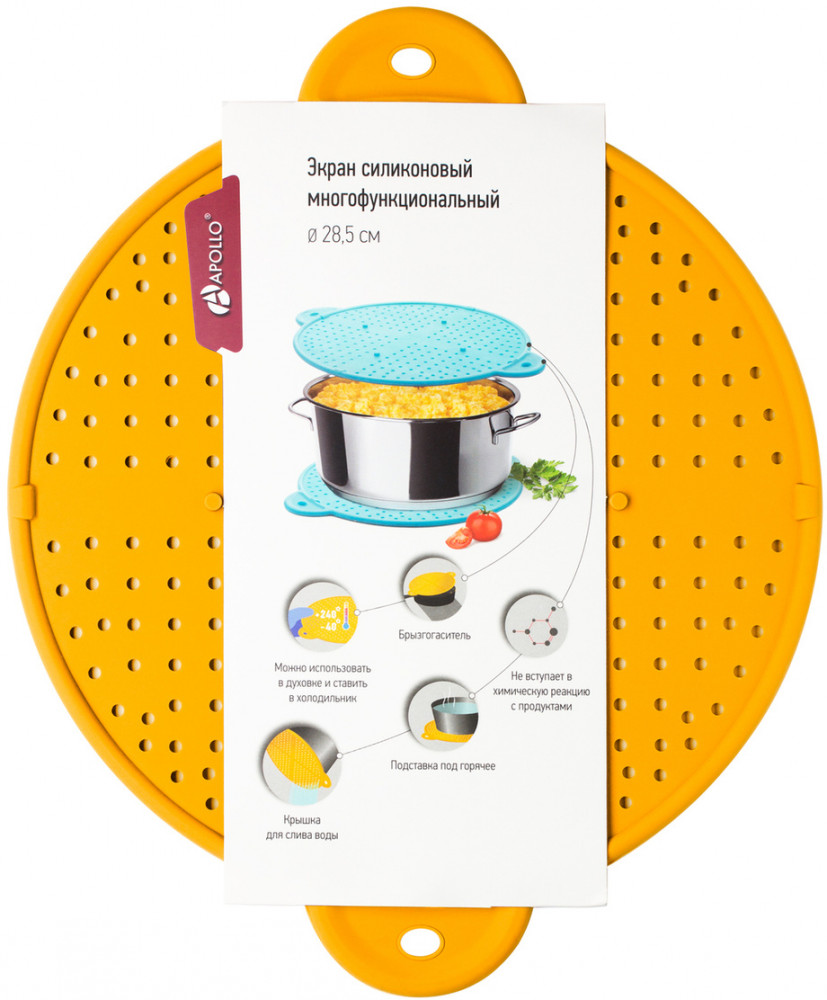 Хороший экран, по приемлемой цене. Силиконовый, мягкий качественный. С ним все именно жарит я, а не парится как под крышкой. Удобные ручки с двух сторон, можно сливать жидкость из кастрюли. И даже использовать, как подставку под горячее.