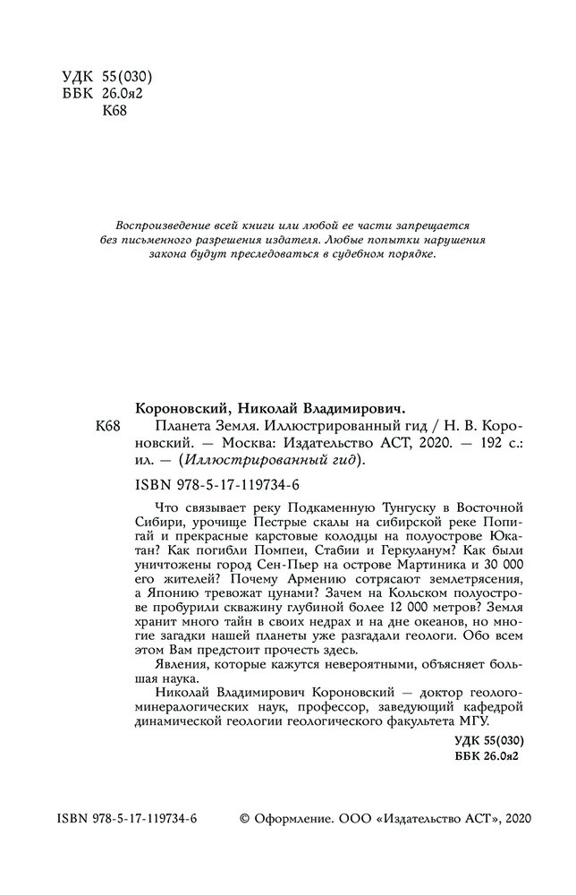 💳 Оплатить за товар можно при получении 🇰🇿 Есть бесплатная доставка по Казахстану 🎁 Копите бонусы с каждой покупки Серия: Иллюстрированный гид Что связывает реку Подкаменную Тунгуску в Восточной Сибири, урочище Пестрые скалы на сибирской реке Попигай и прекрасные карстовые колодцы на полуострове Юкатан? Как погибли Помпеи, Стабии и Геркуланум? Как были уничтожены город Сен-Пьер на острове Мартиника и 30 000 его жителей? Почему Армению сотрясают землетрясения, а Японию тревожат цунами? Зачем на Кольском полуострове пробурили скважину глубиной более 12 000 метров? Земля хранит много тайн в своих недрах и на дне океанов, но многие загадки нашей планеты уже разгадали геологи. Обо всем этом Вам предстоит прочесть здесь. Явления, которые кажутся невероятными, объясняет большая наука. Николай Владимирович Короновский — доктор геолого-минералогических наук, профессор, заведующий кафедрой динамической геологии геологического факультета МГУ. |
