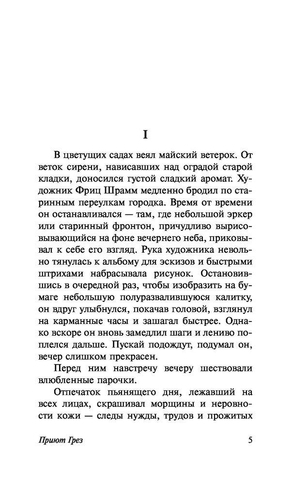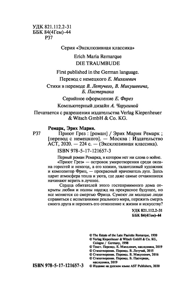 Приют ГрезВ данный момент этот товар отсутствует в продаже. Возможно, у нас найдется аналогичный или похожий товар здесь. Серия: Эксклюзивная классика Первый роман Ремарка, в котором нет ни слова о войне. «Приют Грез» — островок умиротворения среди океана горестей и невзгод, а его хозяин, талантливый художник и композитор Фриц — прекрасный врачеватель душ. Здесь царит атмосфера тепла и уюта, где даже самые отчаявшиеся начинают верить в лучшее. Сердца обитателей этого гостеприимного дома открыты любви и полны надежд на прекрасное будущее, но все меняется со смертью Фрица. Сумеют ли молодые люди справиться с испытаниями реального мира, пережить смерть своего друга и перенять его отношение к жизни и искусству? |