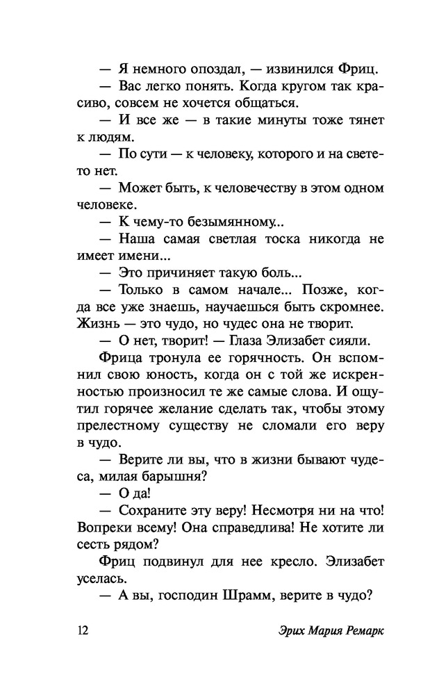 С этого произведения я влюбилась в Ремарка! Все так легко написано! Тепло, любовь, нежность, такие чувства вызвала у меня история! Спокойная, расслабляющая!