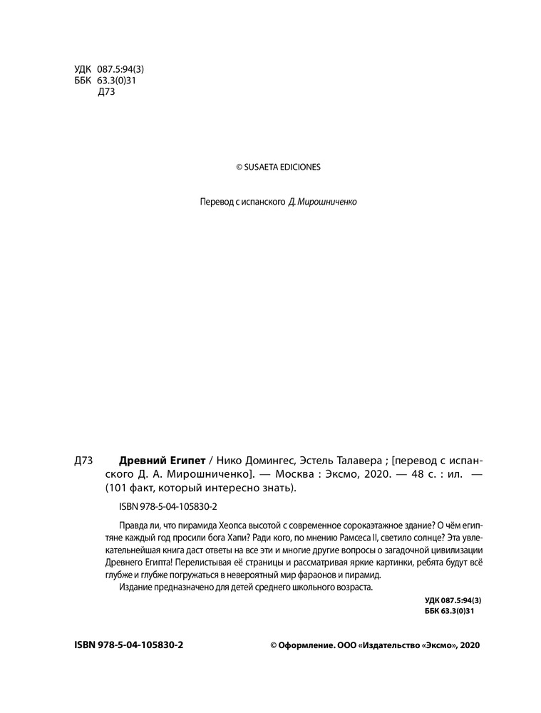 💳 Оплатить за товар можно при получении 🇰🇿 Есть бесплатная доставка по Казахстану 🎁 Копите бонусы с каждой покупки Серия: 101 факт, который интересно знать Эта книга станет отличным подарком для ребят, увлекающихся Древним Египтом и стремящихся узнать о нём всё самое интересное. Здесь нет сложных длинных статей и малопонятных терминов — только любопытнейшие факты, изложенные доступным и образным языком, плюс большие яркие изображения пирамид, фараонов и таинственных ритуалов! |