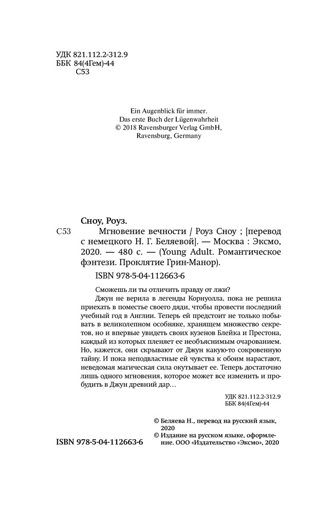 💳 Оплатить за товар можно при получении 🇰🇿 Есть бесплатная доставка по Казахстану 🎁 Копите бонусы с каждой покупки Серия: Young Adult. Романтическое фэнтези. Проклятие Грин-Манор Сможешь ли ты отличить правду от лжи? Джун не верила в легенды Корнуолла, пока не решила приехать в поместье своего дяди, чтобы провести последний учебный год в Англии. Теперь ей предстоит не только побывать в великолепном особняке, хранящем множество секретов, но и впервые увидеть своих кузенов Блейка и Престона, каждый из которых пленяет ее необъяснимым очарованием. Но, кажется, что они скрывают от Джун какую-то сокровенную тайну. И пока неподвластные ей чувства к обоим нарастают, неведомая магическая сила окутывает ее. Теперь достаточно лишь одного мгновения, которое может все изменить и пробудить в Джун древний дар... |