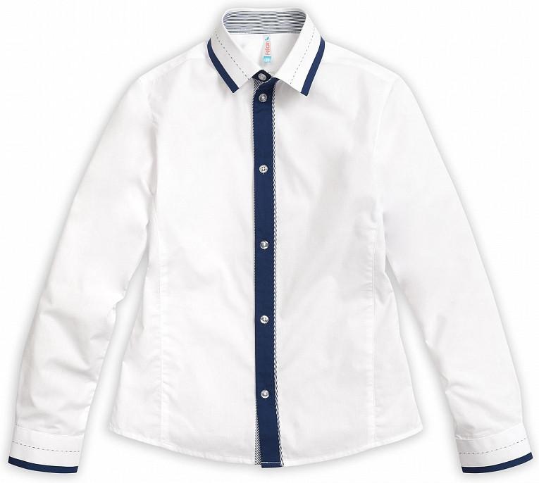 Рубашка для мальчиков с длинным рукавом. Сорочка полуприлегающего силуэта с рельефами из проймы на переде и спинке. Воротник типа Windsor. По внешнему краю воротника декоративная окантовка контрастного цвета. В поддержку отделки на воротнике из такой же ткани контрастного цвета выполнены внешняя сторона стойки воротника, верхняя планка (с петлями), а также притачная полоска по нижнему краю манжет. Нижняя планка (с пуговицами), внутренняя стойка воротника и узкий декоративный кант вдоль планки на левой части переда выполнены из отделочной ткани в мелкую полоску. По воротнику и манжетам проходит декоративная строчка контрастного цвета, имитирующая ручной стежок.