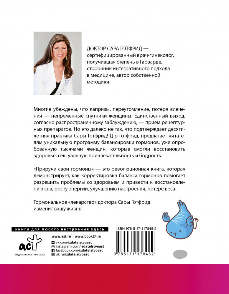 Доктор Готфрид написала замечательную книгу для всех женщин, которые хотят жить полной и здоровой жизнью, при этом не сидя на бесконечных лекарствах. Каждой женщине знаком стресс, раздражение, дурное настроение: им говорят, что это гормоны, и добавляют, что «такова женская доля». Доктор Готфрид уверена, что так быть не должно! Она предлагает уникальную методику, как сделать свои гормоны здоровыми: никаких таблеток, только натуральные продукты и советы профессионала, основанные на научных данных.