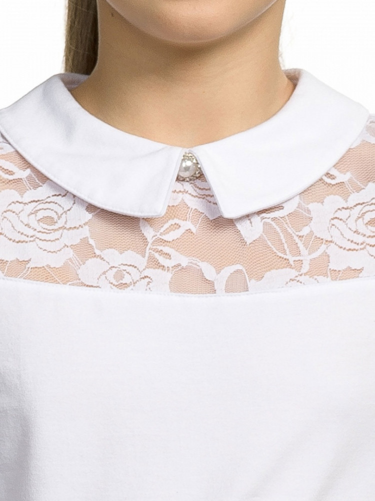 Трикотажная блузка для девочек из мягкого хлопкового трикотажа с добавлением эластана. Отложной воротничок с большой жемчужной пуговицей со стразами. Кокетка и рукава, присборенные по окату, из очень мягкого пластичного кружева. На спинке застежка на пуговку.