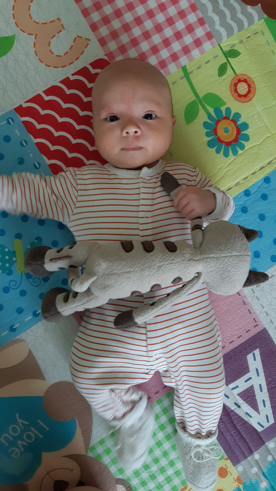 Котик славный! 2-месячный малыш любит обманывать его. Лапки и хвостик само то помещаются в ручке малыша. Котик наш первый друг!