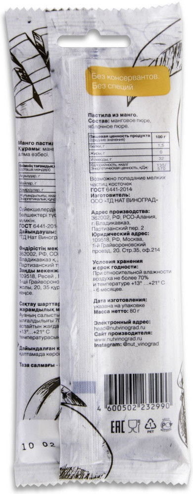 Пастила натуральная, в принципе вкусная. Но вкуса манго я не почувствовала, вкус яблока.