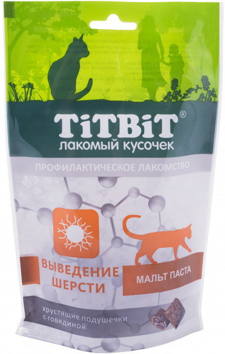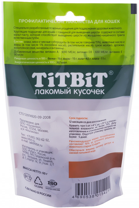 TiTBiT Подушечки хрустящие с говядиной для кошек-20% +29 вкусные высокая поедаемость выводят шерсть сухие