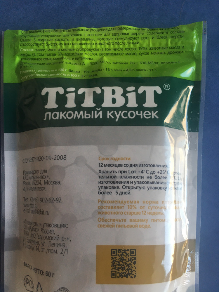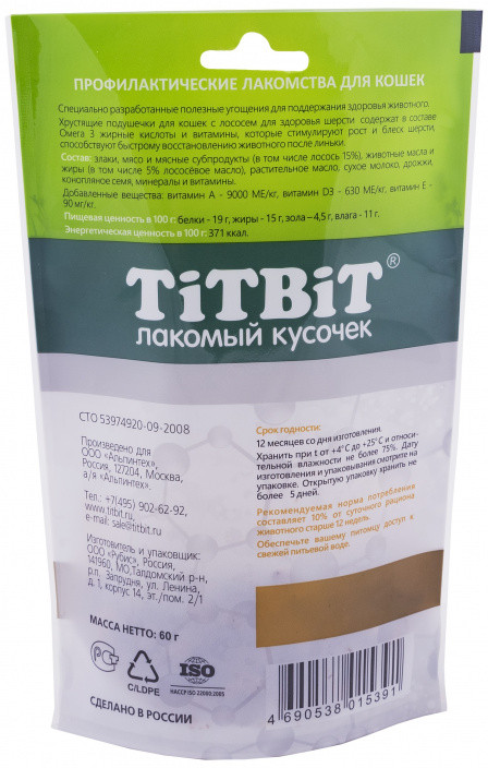 TiTBiT Подушечки хрустящие с лососем для кошек-20% +28 хрустящая текстура еда нравится меньше шерсти жирность