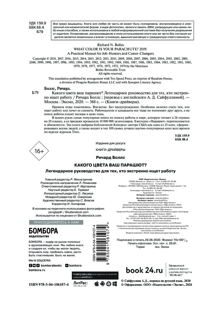💳 Оплатить за товар можно при получении 🇰🇿 Есть бесплатная доставка по Казахстану от 1 дня 🎁 Копите бонусы с каждой покупки Серия: Правила работы Правила игры изменились. Внезапно. Без предупреждения. Особенно нелегко стало тем, кто ищет работу или хочет ее сменить. Работодатели и кандидаты все чаще не понимают друг друга, а на поиск работы уходят месяцы и даже годы. В ваших руках самая популярная книга по поиску работы в мире, которую читают в 26 странах на 20 языках, а ее продажи превысили 10 000 000 экземпляров. Ежегодно «Парашют» переписывается и обновляется. Эта книга выбрана библиотекой Конгресс-центра США как одна из 25 книг, сформировавших жизнь людей, а также входит в топ 100 самых лучших научно-популярных книг всех времен по версии журнала Time. |