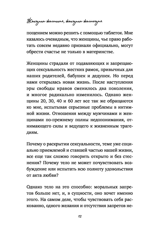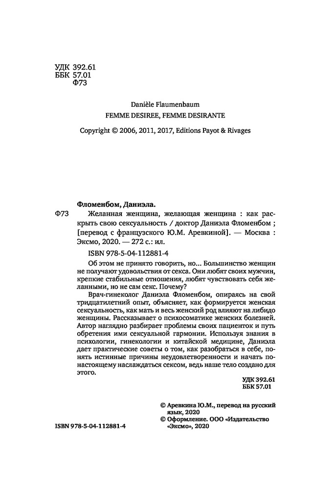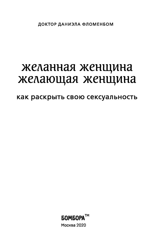 💳 Оплатить за товар можно при получении 🇰🇿 Есть бесплатная доставка по Казахстану от 1 дня 🎁 Копите бонусы с каждой покупки Серия: Психология влечения. Книги о любви и желании Об этом не принято говорить, но... Большинство женщин не получают удовольствия от секса. Они любят своих мужчин, крепкие стабильные отношения, любят чувствовать себя желанными, но не сам секс. Почему? Врач-гинеколог Даниэла Фломенбом, опираясь на свой тридцатилетний опыт, объясняет, как формируется женская сексуальность, как мать и весь женский род влияют на либидо женщины. Рассказывает о психосоматике женских болезней. Автор наглядно разбирает проблемы своих пациенток и путь обретения ими сексуальной гармонии. Используя знания в психологии, гинекологии и китайской медицине, Даниэла дает практические советы о том, как разобраться в себе, понять истинные причины неудовлетворенности и начать по-настоящему наслаждаться сексом, ведь наше тело создано для этого. |