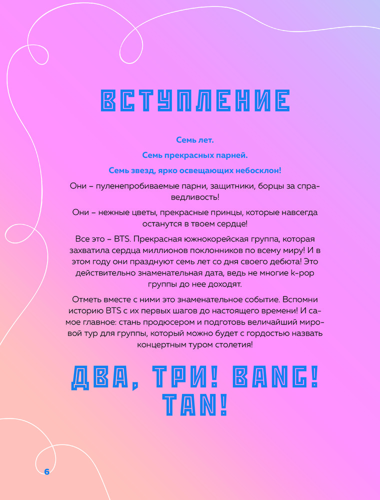 В данный момент этот товар отсутствует в продаже. Возможно, у нас найдется аналогичный или похожий товар здесь. Серия: K-POP. Главные книги о корейской культуре Один, два! Bang! Tan! Три-четыре-пять-шесть-СЕМЬ! Уже целых семь лет ребята радуют нас своим зажигательным творчеством! Хороший повод отметить и помечтать в ожидании новостей. Перед тобой новый фанбук с заданиями, в которых ты сможешь проверить, насколько хорошо ты знаешь биографию группы, раскрасить портреты ребят, попробовать себя в роли продюсера и сделать бумажные фигурки каждого участника! Пуленепробиваемые парни не дадут тебе соскучиться! |