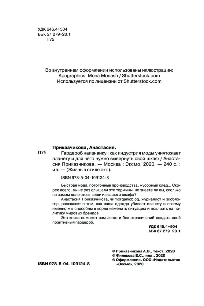 Гардероб наизнанку. Как индустрия моды уничтожает планету и для чего нужно вывернуть свой шкафВ данный момент этот товар отсутствует в продаже. Возможно, у нас найдется аналогичный или похожий товар здесь. Серия: Жизнь в стиле эко Быстрая мода, потогонные производства, мусорный след... Скорее всего, вы не раз слышали эти термины, но знаете ли вы, сколько на самом деле стоят вещи из вашего шкафа? Анастасия Приказчикова, @imorganicblog, журналист и экоблогер, расскажет о том, как наша одежда убивает планету и почему именно мы способны в корне изменить ситуацию и повлиять на политику мировых брендов. Эта книга поможет вам легко и без ограничений создать свой позитивный гардероб. |
