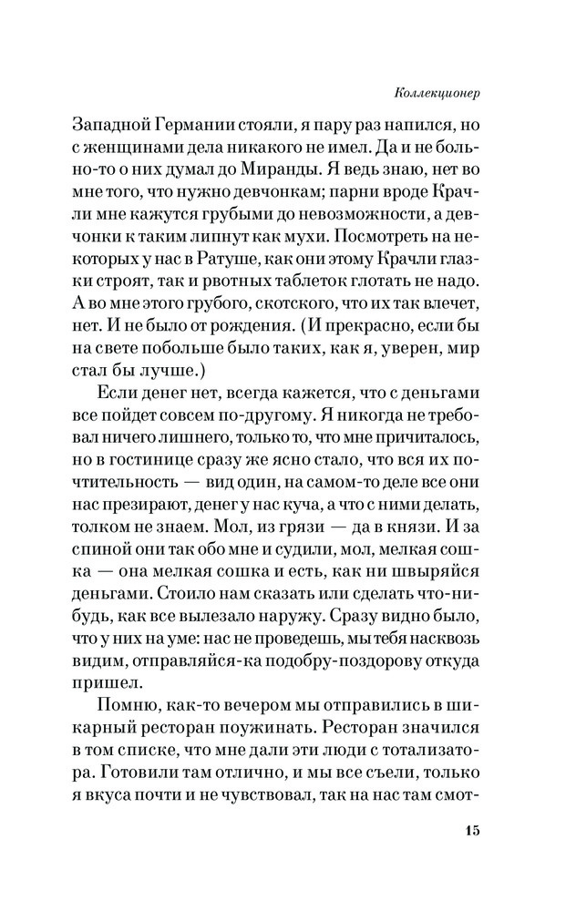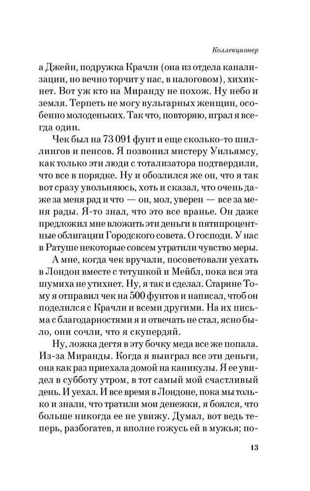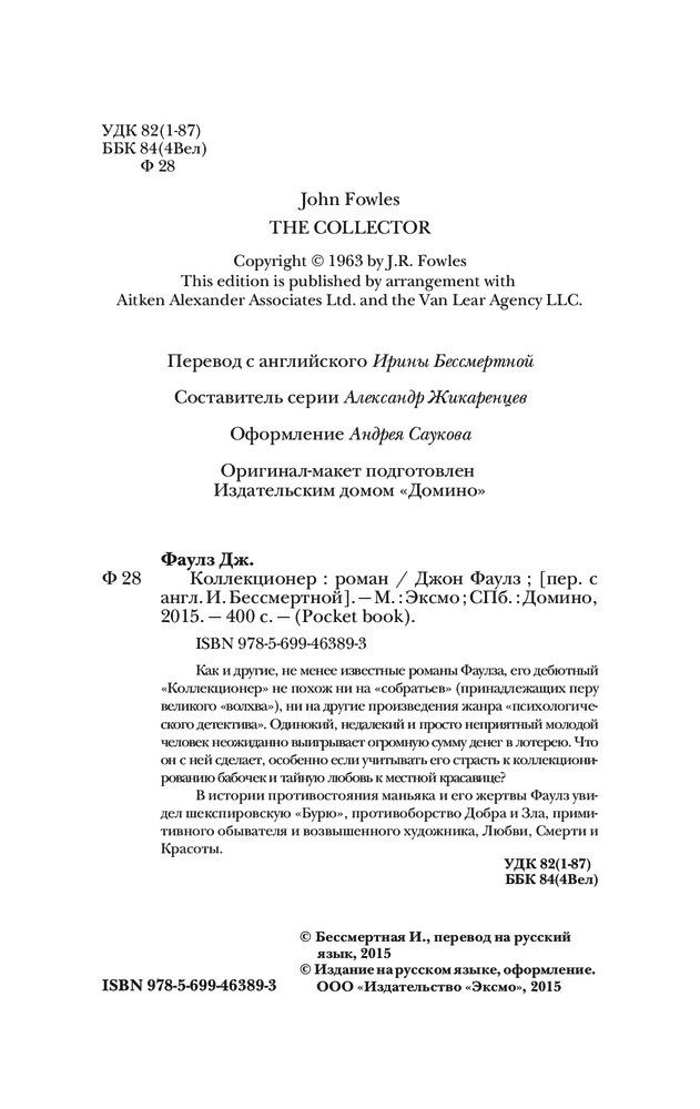 КоллекционерВ данный момент этот товар отсутствует в продаже. Возможно, у нас найдется аналогичный или похожий товар здесь. Серия: Pocket Book (обложка) Как и другие не менее известные романы Фаулза, его дебютный «Коллекционер» не похож ни на «собратьев» (принадлежащих перу великого «волхва»), ни на другие произведения жанра «психологического детектива». Одинокий, недалекий и просто неприятный молодой человек неожиданно выигрывает огромную сумму денег в лотерею. Что он с ней сделает, особенно если учитывать его страсть к коллекционированию бабочек и тайную любовь к местной красавице? |