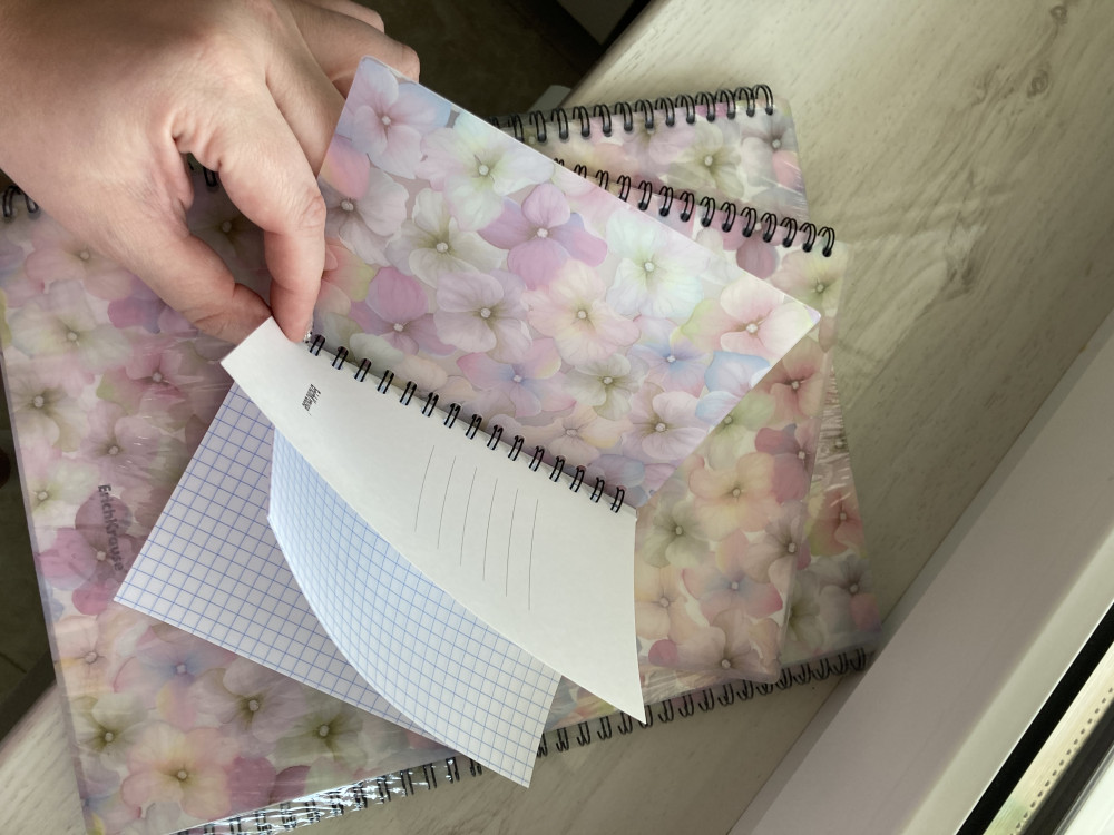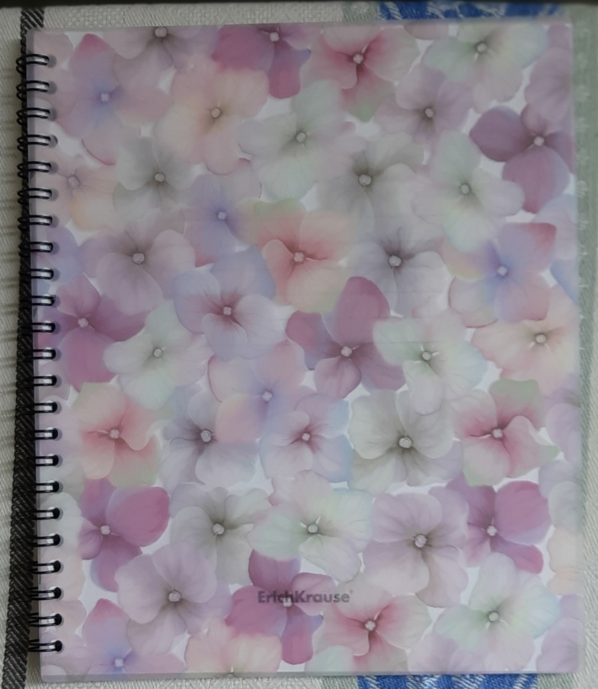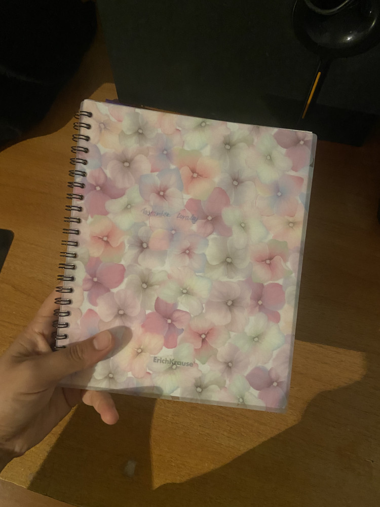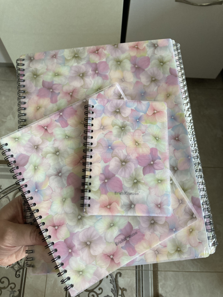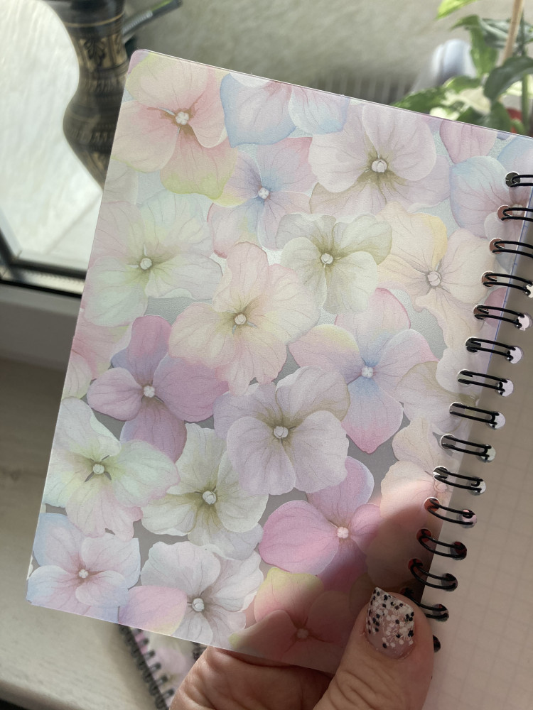 Обложка очень нежная красивая! Полупрозрачная гибкая пластиковая! Листы из белой бумаги в клетку, спиралька надежная! Я довольна!