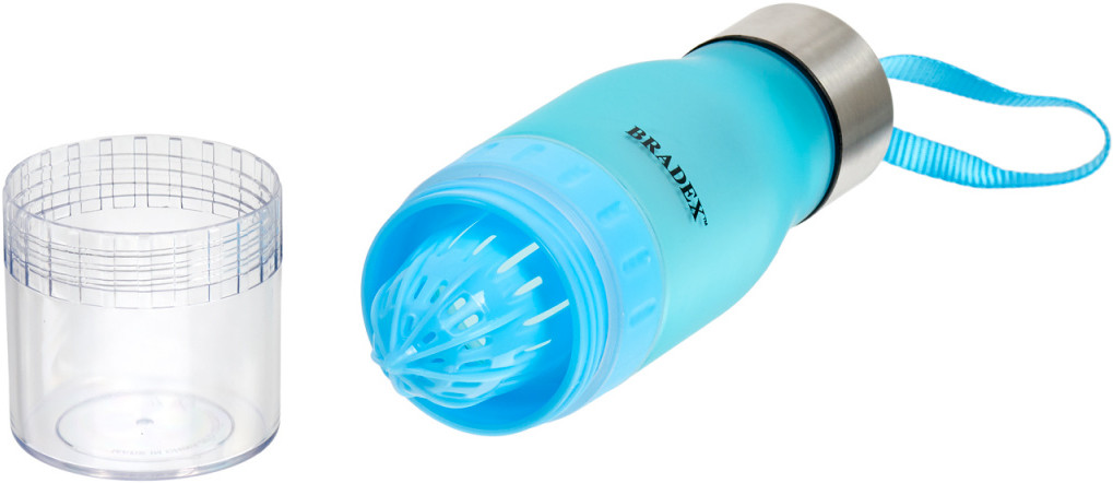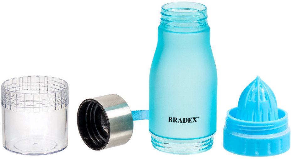 Большая, горлышко широкое, не протекает, пластик хрупкий, т.е. аккуратно, ронять не рекомендую, при бережном обращении послужит, но недолго, хотя, пластик надо выкидывать. Фишка для цитрусов классная. В общем, посмотрим как покажет себя в эксплуатации.