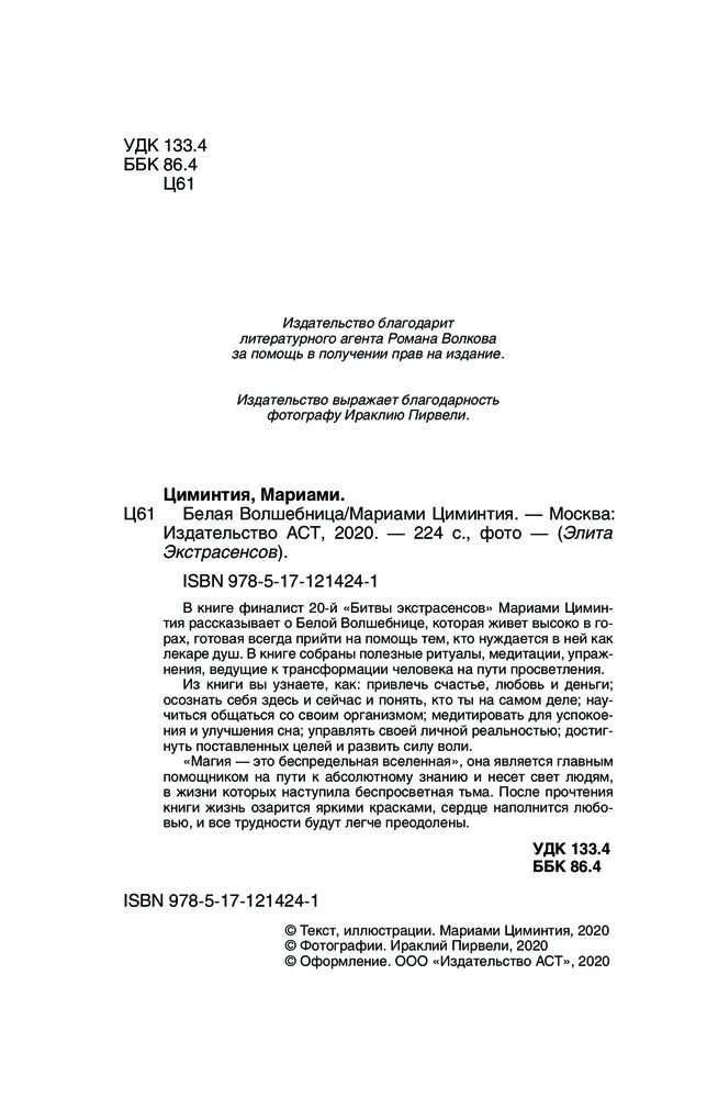 💳 Оплатить за товар можно при получении 🇰🇿 Есть бесплатная доставка по Казахстану от 1 дня 🎁 Копите бонусы с каждой покупки Серия: Элита Экстрасенсов В книге финалист 20-й «Битвы экстрасенсов» Мариами Циминтия рассказывает о Белой Волшебнице, которая живет высоко в горах, готовая всегда прийти на помощь тем, кто нуждается в ней как лекаре душ. В книге собраны полезные ритуалы, медитации, упражнения, ведущие к трансформации человека на пути просветления. Из книги вы узнаете, как: привлечь счастье, любовь и деньги; осознать себя здесь и сейчас и понять, кто ты на самом деле; научиться общаться со своим организмом; медитировать для успокоения и улучшения сна; управлять своей личной реальностью; достигнуть поставленных целей и развить силу воли. «Магия — это беспредельная вселенная», она является главным помощником на пути к абсолютному знанию и несет свет людям, в жизни которых наступила беспросветная тьма. После прочтения книги жизнь озарится яркими красками, сердце наполнится любовью, и все трудности будут легче преодолены. |