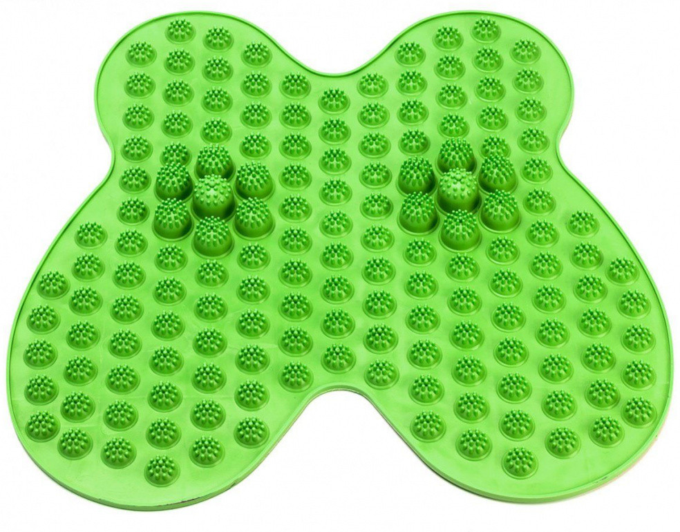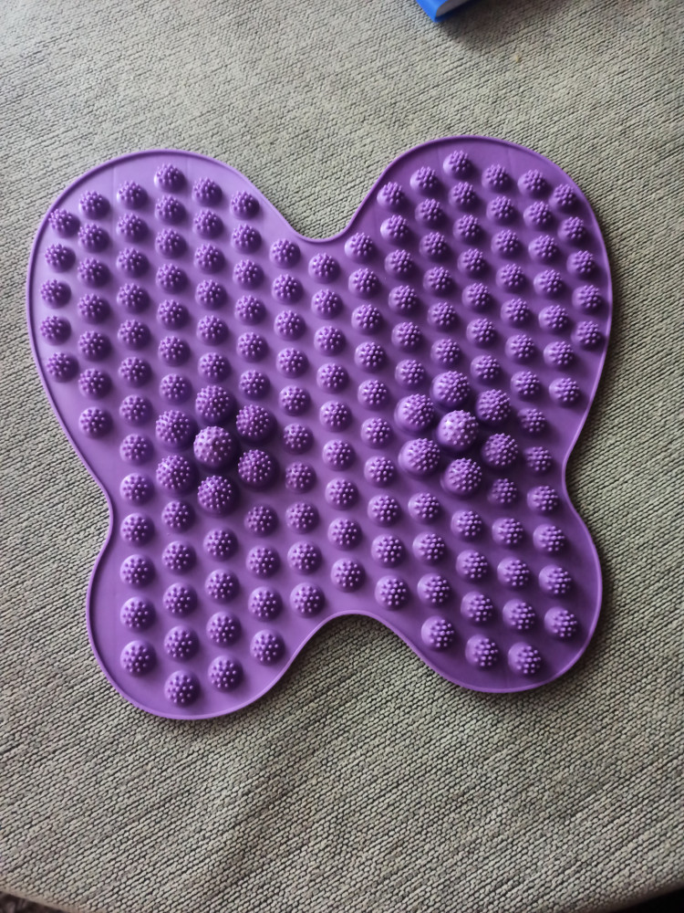 Коврик работает как галька, хорошо снимает общее напряжение и усталость. Можно стоять на коврике (более сильное воздействие), можно сидеть на стуле и ставить на него стопы - легкий релакс.