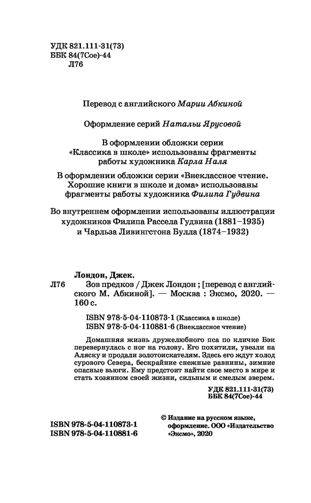 В данный момент этот товар отсутствует в продаже. Возможно, у нас найдется аналогичный или похожий товар здесь. Серия: Внеклассное чтение Домашняя жизнь дружелюбного пса по кличке Бэк перевернулась с ног на голову. Его похитили, увезли на Аляску и продали золотоискателям. Здесь его ждут холод сурового Севера, бескрайние снежные равнины, зимние опасные вьюги. Ему предстоит найти свое место в мире и стать хозяином своей жизни, сильным и смелым зверем. |